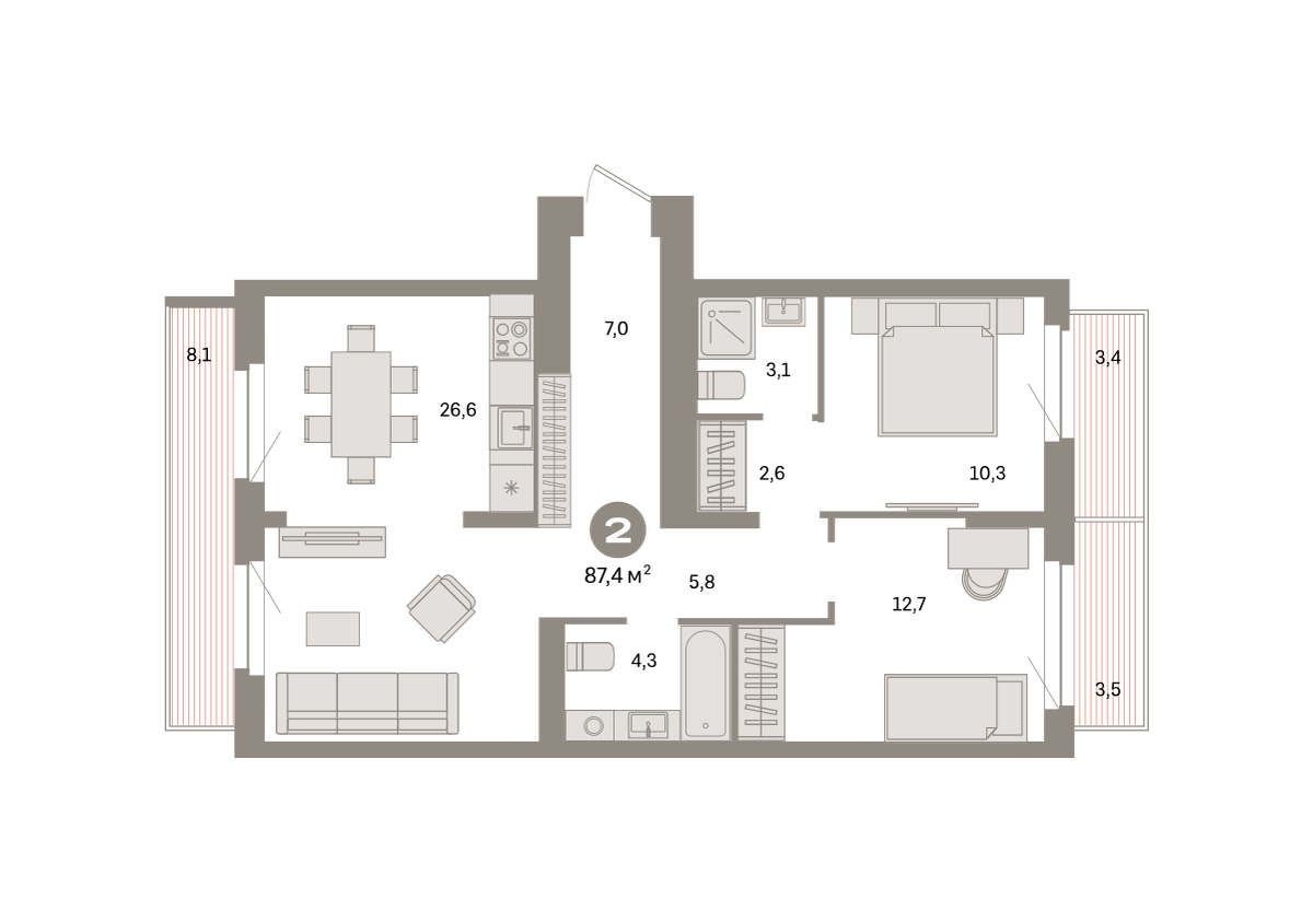 Квартира с кухней-гостиной и двумя спальнями в квартале «Депо». Особенности планировки: балкон, вид во двор, второй санузел, гардеробная, мастер-спальня, окна на две стороны, предчистовая отделка, разнесённые спальни.