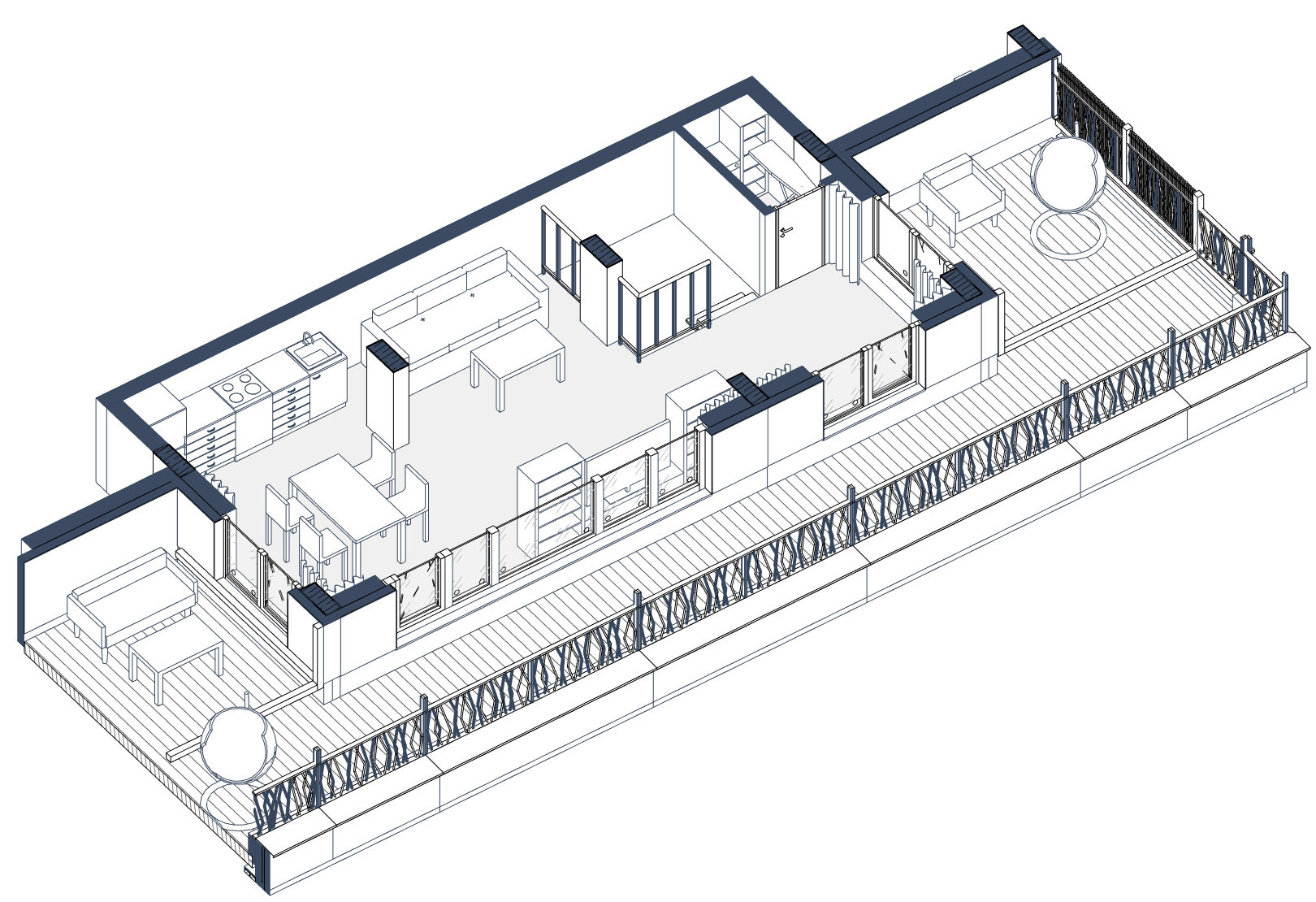 Двор закрыт от машин и оформлен в стиле скандинавского натурализма. Он похож на парк, сформировавшийся без участия человека и сохраняющий обаяние в течение всего года. Под домом запроектирован подземный паркинг, а также кладовые для хранения сезонных вещей.
