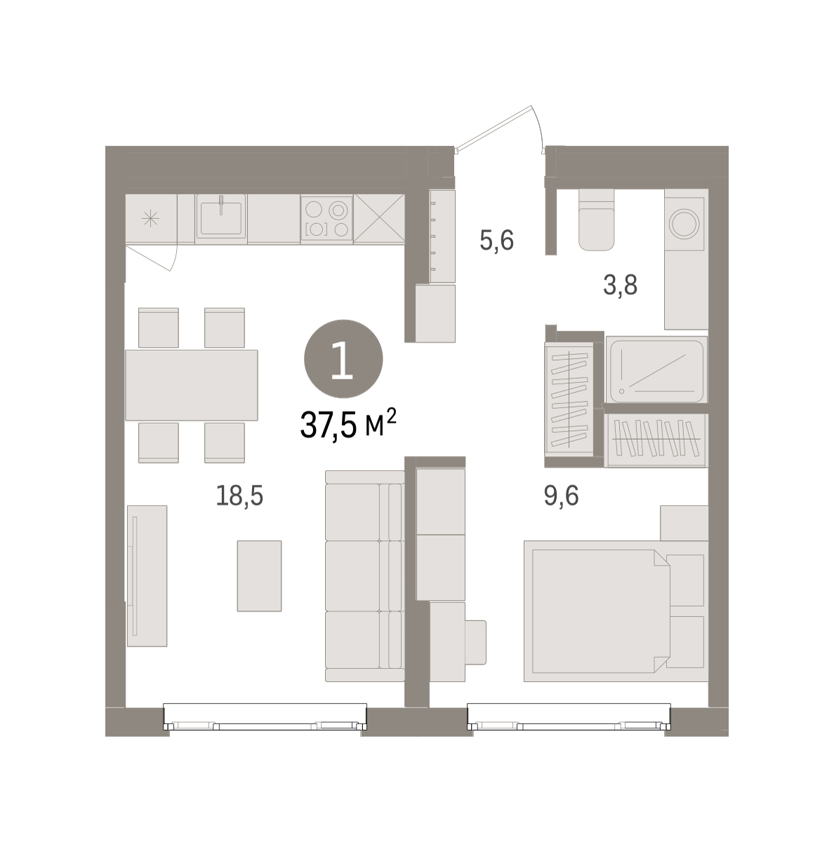 Квартира с кухней-гостиной и одной спальней в квартале «Траектория». Особенности планировки: предчистовая отделка, стартовая цена. № квартиры в нашей базе: МНВ01-Ж4.3.4.