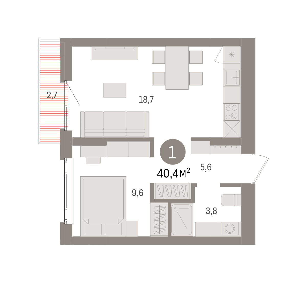 Квартира с кухней-гостиной и одной спальней в квартале «Траектория». Особенности планировки: балкон, предчистовая отделка. № квартиры в нашей базе: МНВ01-Ж6.4.3.
