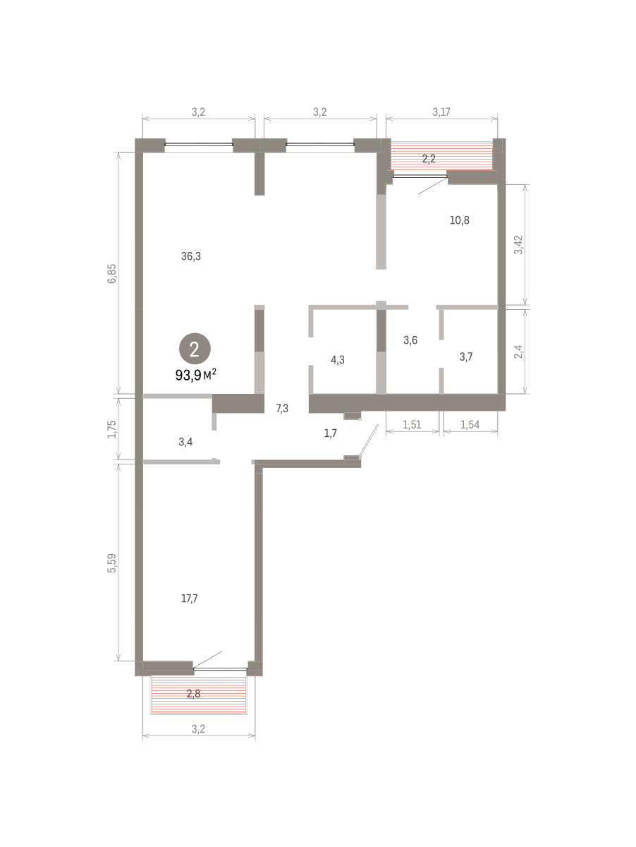 Квартира с кухней-гостиной и двумя спальнями в Южных кварталах. Особенности планировки: балкон, вид во двор, гардеробная, лоджия, мастер-спальня, окна на две стороны, предчистовая отделка, разнесённые спальни.
