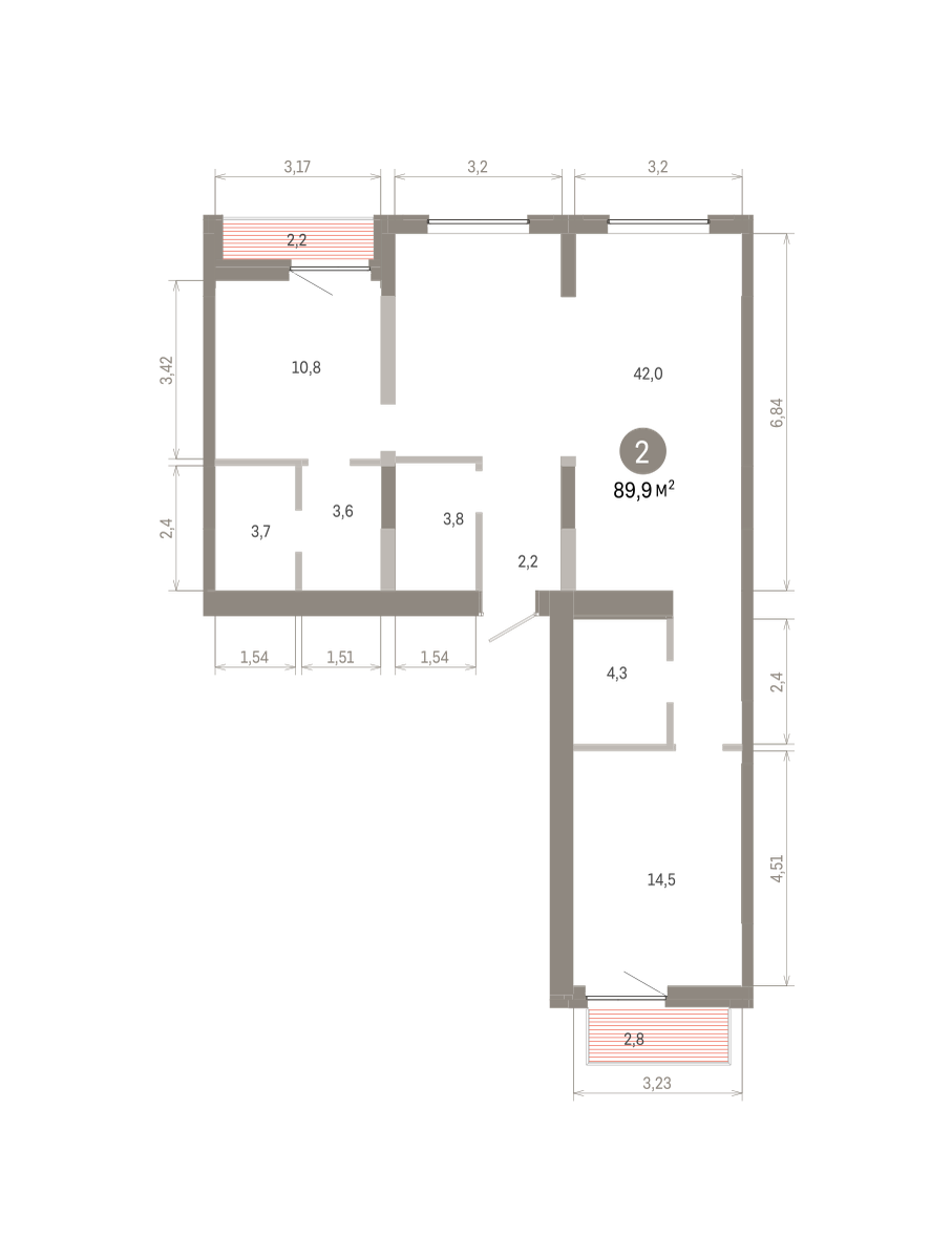 Квартира с кухней-гостиной и двумя спальнями в Южных кварталах. Особенности планировки: балкон, вид во двор, гардеробная, лоджия, мастер-спальня, окна на две стороны, постирочная, предчистовая отделка, разнесённые спальни.