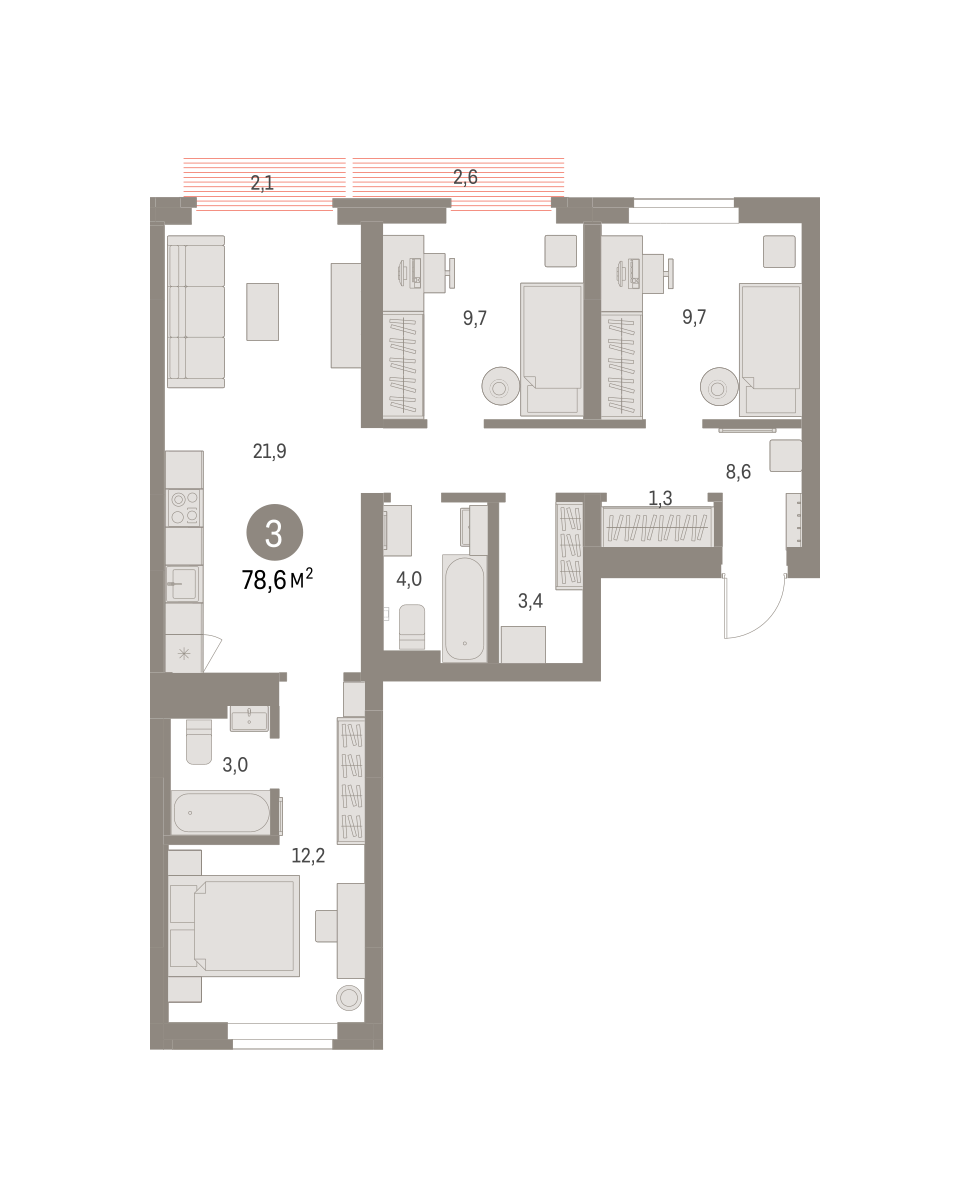 Продаётся с кладовой. Квартира с кухней-гостиной и тремя спальнями в Бруснике в Академическом. Особенности планировки: второй санузел, мастер-спальня, предчистовая отделка. № квартиры в нашей базе: АКД04-Ж2.5.8.