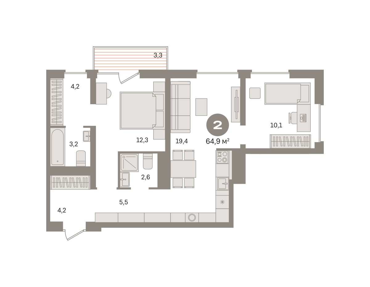 Продаётся с кладовой. Квартира с кухней-гостиной и двумя спальнями в Северном квартале. Особенности планировки: мастер-спальня, предчистовая отделка. № квартиры в нашей базе: СКВ04.2-Ж1.5.1.