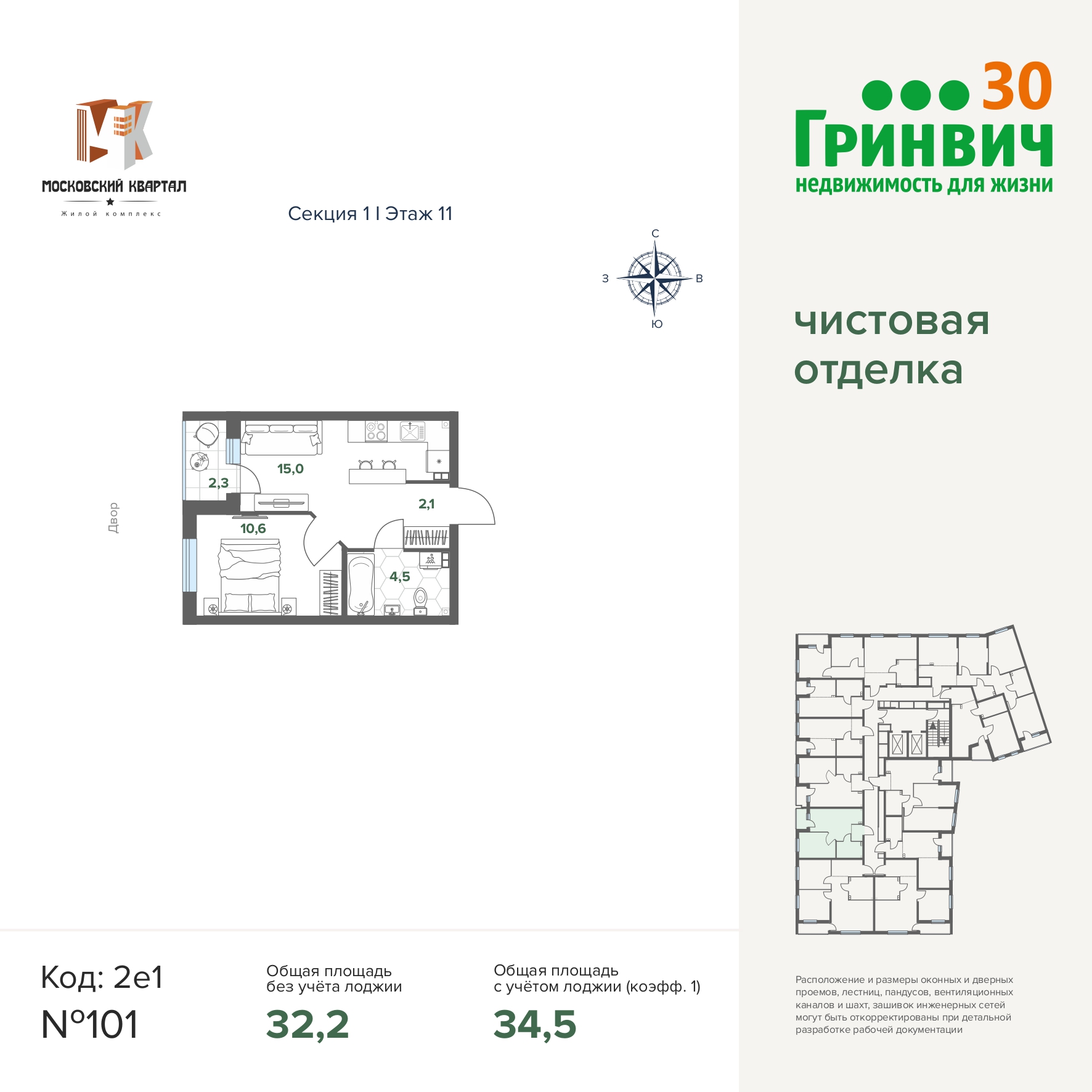 34.50 м² | 11 - 17 эт.