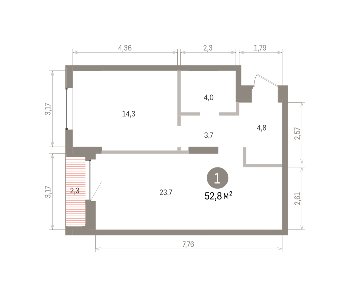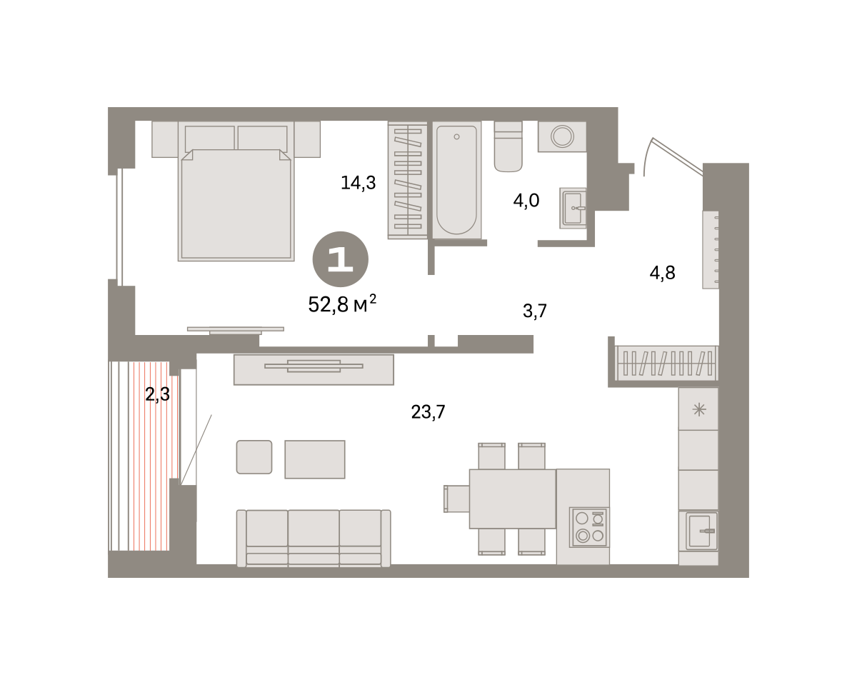 Квартира с кухней-гостиной и одной спальней в квартале «Депо». Особенности планировки: предчистовая отделка. № квартиры в нашей базе: ДЕП07-Ж1.5.3.