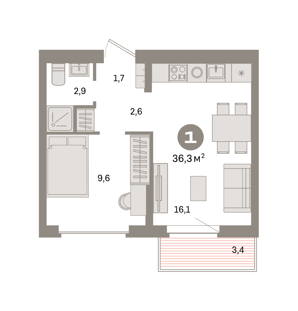 Квартира с кухней-гостиной и одной спальней в квартале «Депо». Особенности планировки: предчистовая отделка. № квартиры в нашей базе: ДЕП04-Ж2.7.4.