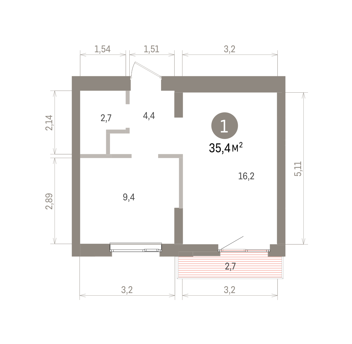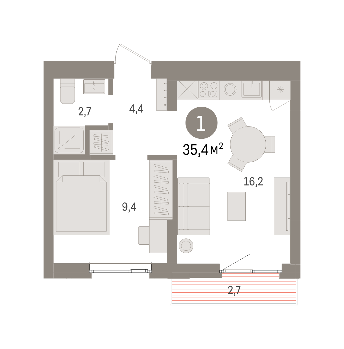 Квартира с кухней-гостиной и одной спальней в квартале «Траектория». Особенности планировки: предчистовая отделка. № квартиры в нашей базе: МНВ01-Ж7.5.8.