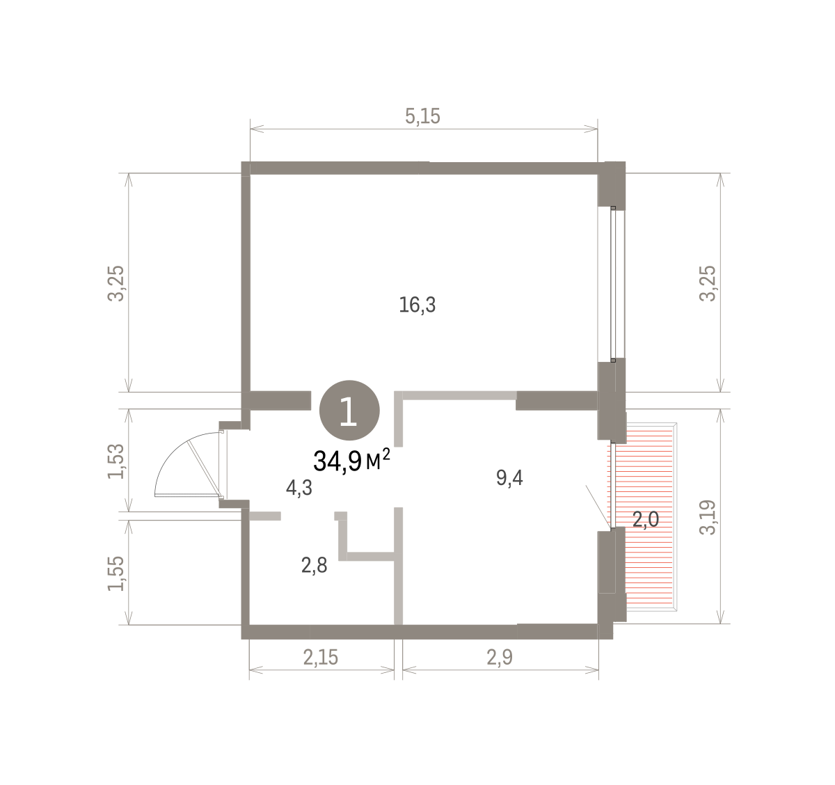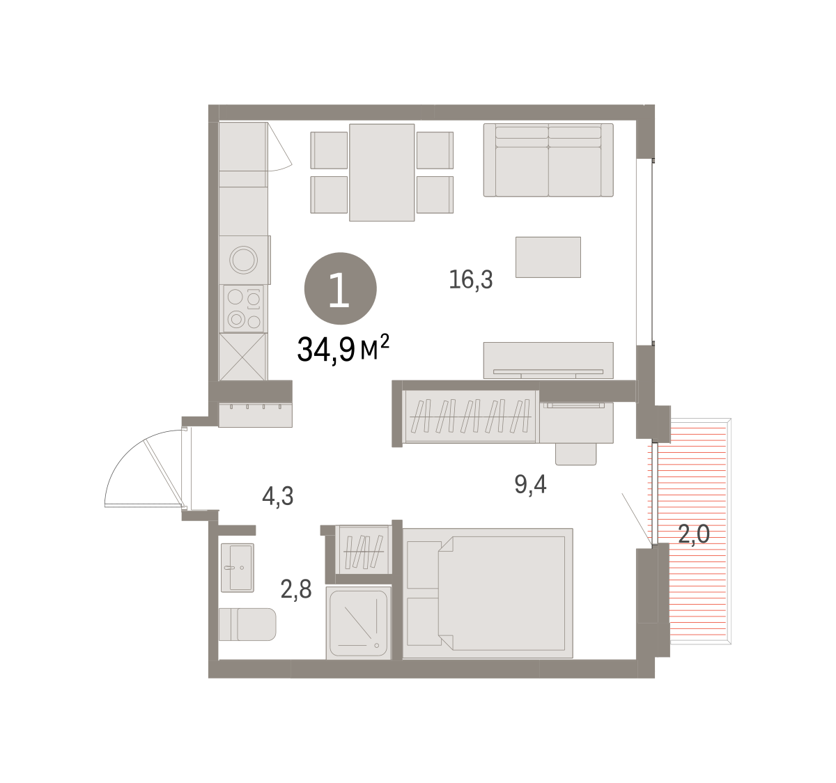 Квартира с кухней-гостиной и одной спальней в Бруснике в Академическом. Особенности планировки: балкон, предчистовая отделка. № квартиры в нашей базе: АКД05-Ж8.5.1.