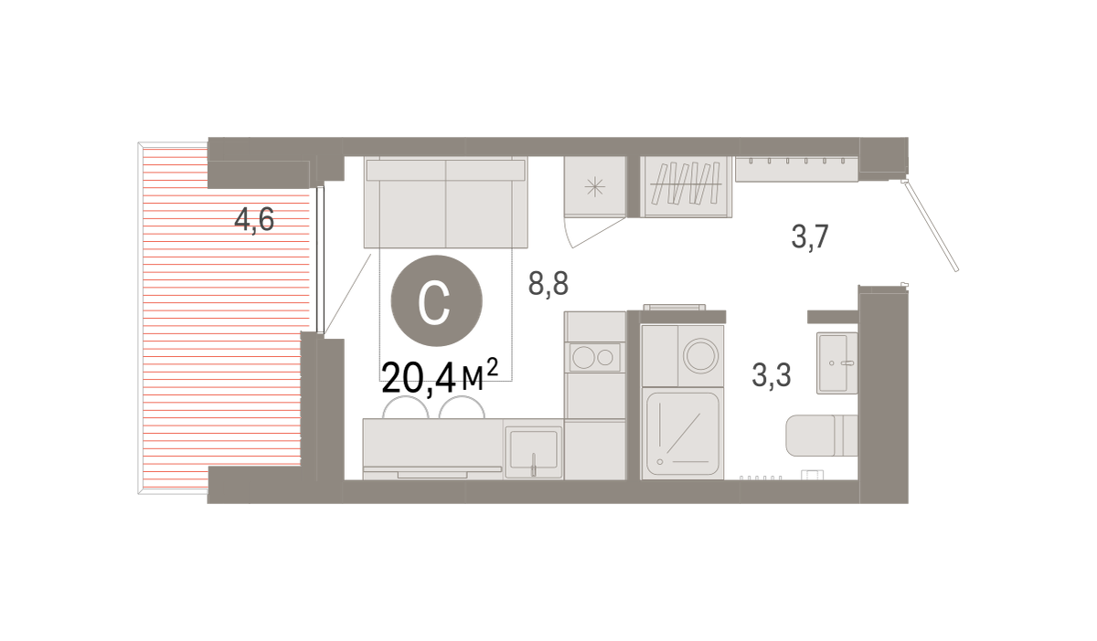 Студия в Бруснике в Академическом. Особенности планировки: балкон, предчистовая отделка. № квартиры в нашей базе: АКД04-Ж5.7.4.