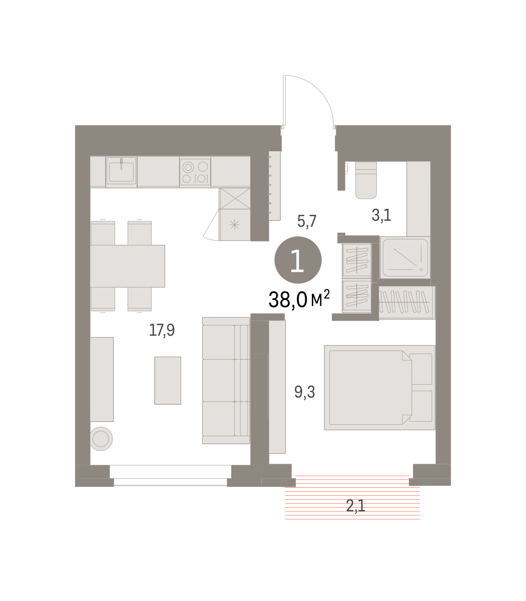 Квартира с кухней-гостиной и одной спальней в Бруснике в Академическом. Особенности планировки: балкон, предчистовая отделка. № квартиры в нашей базе: АКД04-Ж3.2.4.