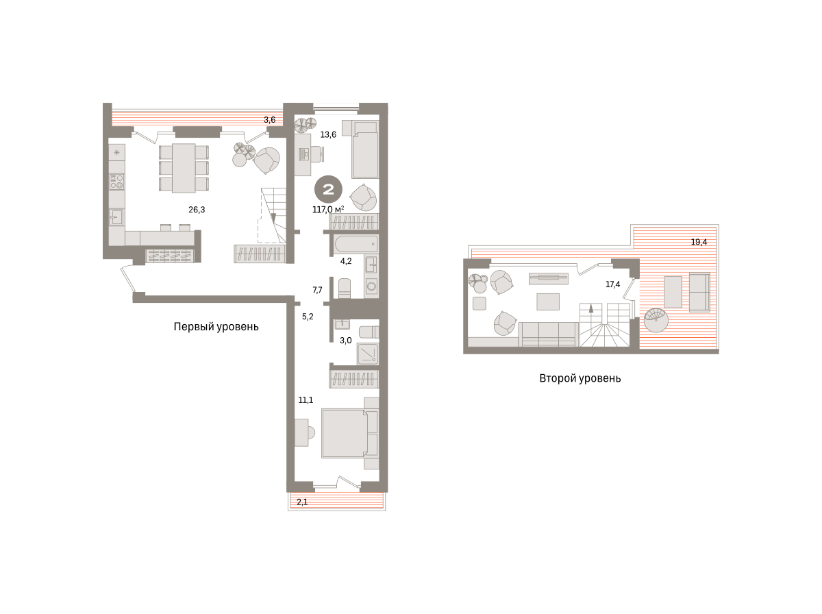 Двухуровневая квартира с кухней-гостиной и двумя спальнями в Южных кварталах. Особенности планировки: двухуровневая, летняя кухня на крыше, предчистовая отделка, разнесённые спальни, терраса на крыше.