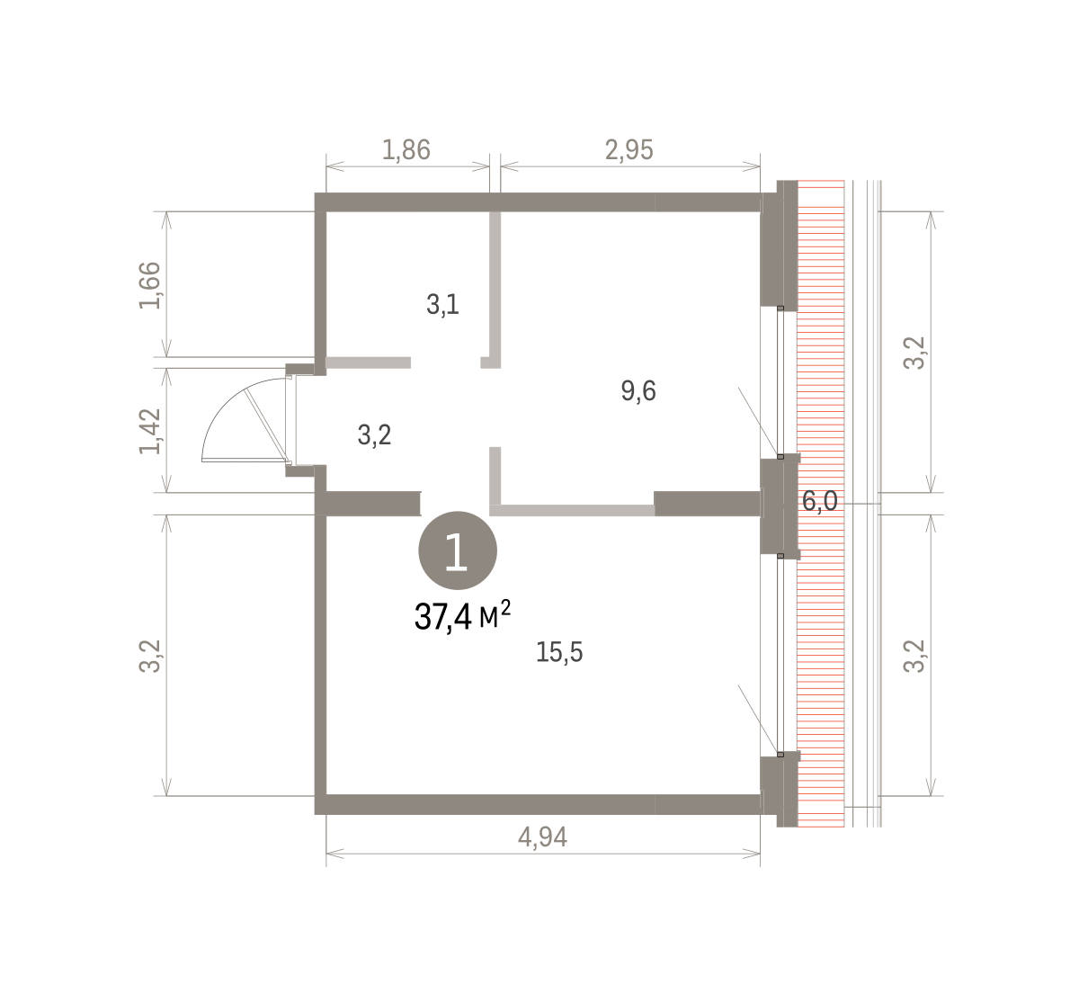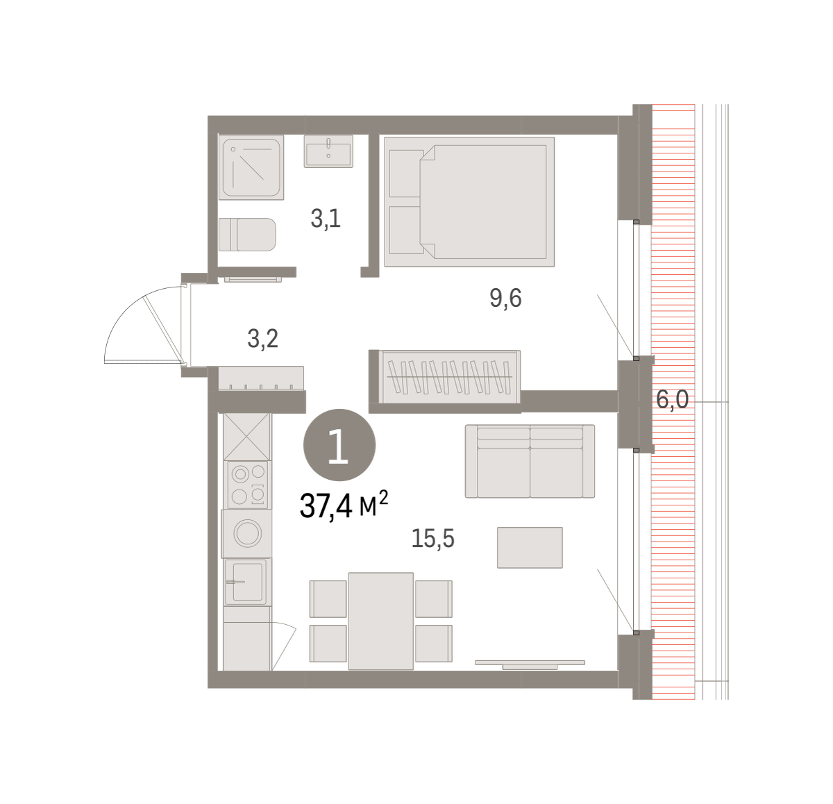 1-к квартира | 35.54 м² | 12 - 17 эт.