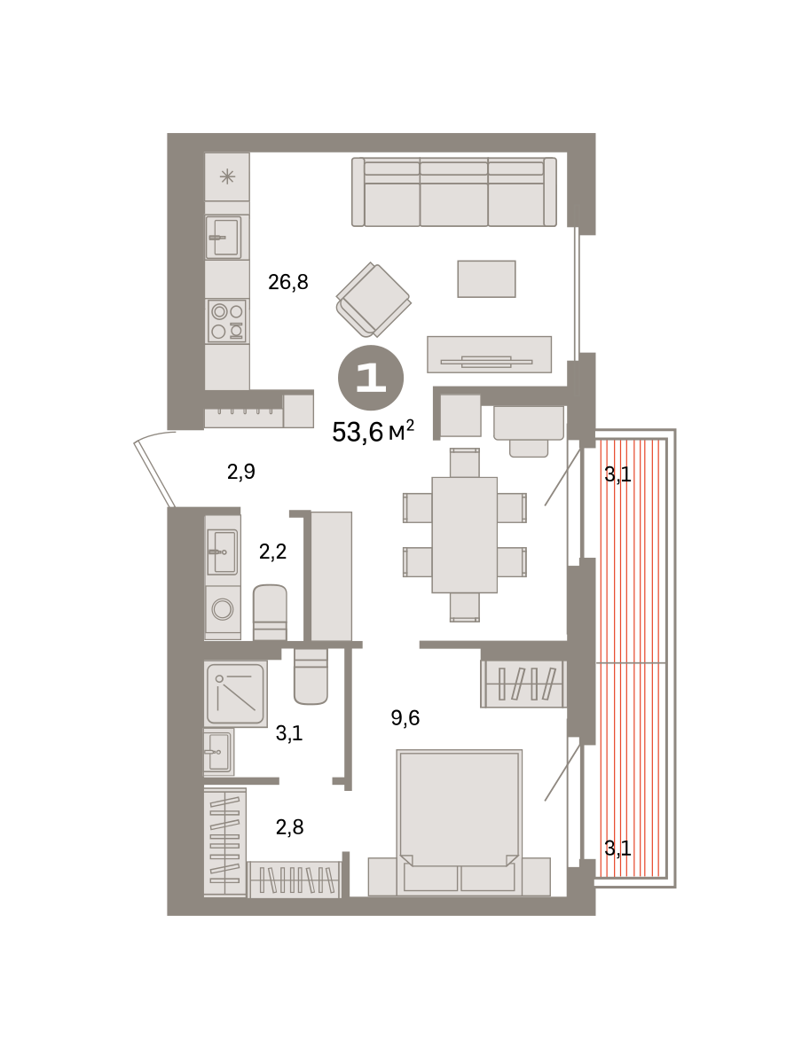 Квартира с кухней-гостиной и одной спальней в квартале «Депо». Особенности планировки: балкон, предчистовая отделка. № квартиры в нашей базе: ДЕП04-Ж4.9.4.