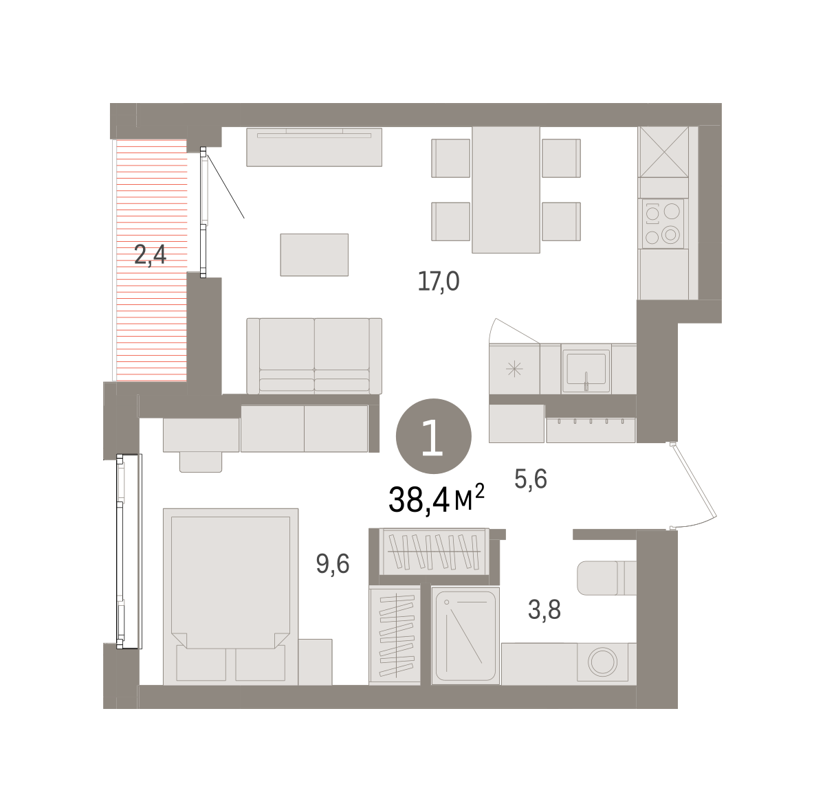 Квартира с кухней-гостиной и одной спальней в квартале «Траектория». Особенности планировки: предчистовая отделка. № квартиры в нашей базе: МНВ01-Ж7.5.5.