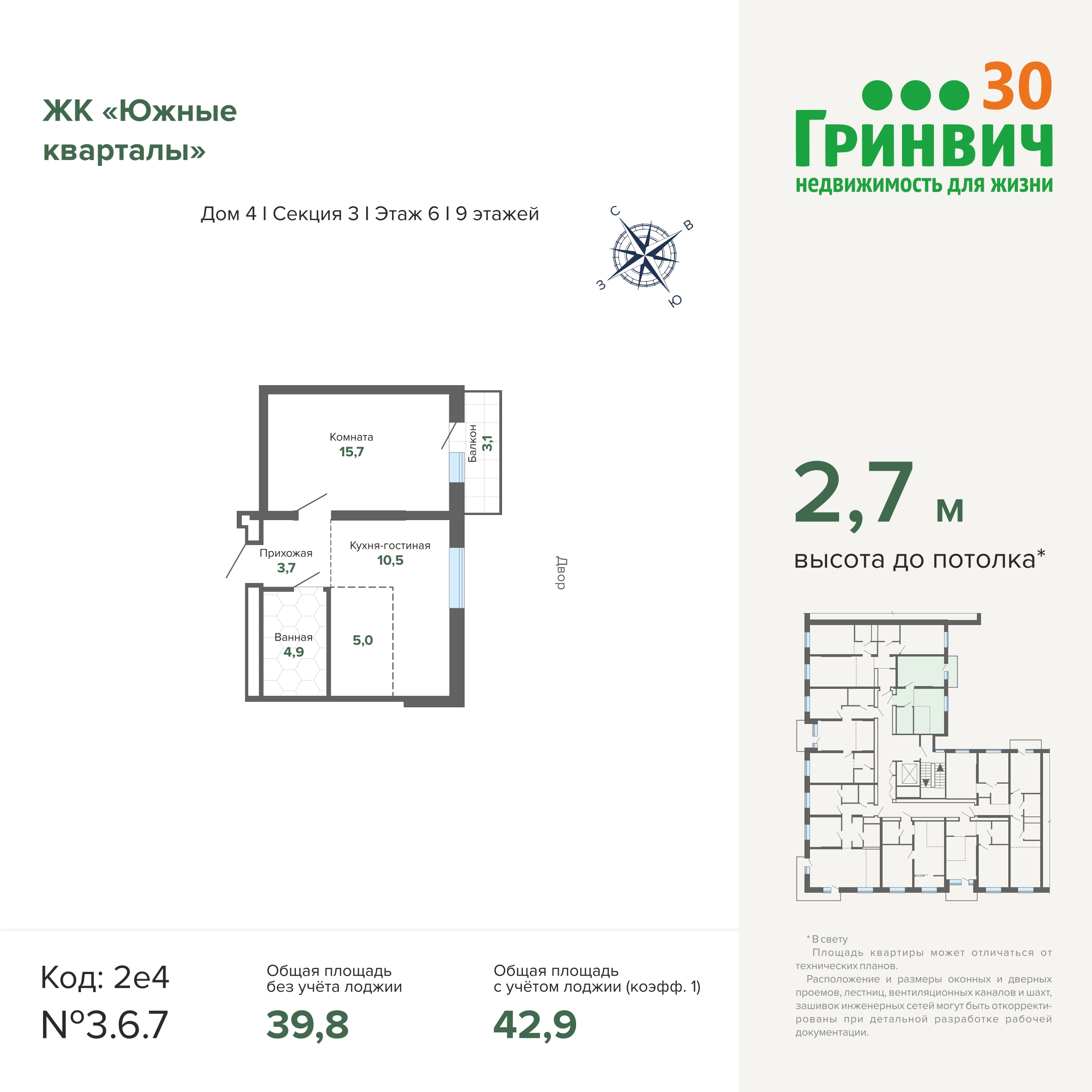 • Потолок 2,7 м