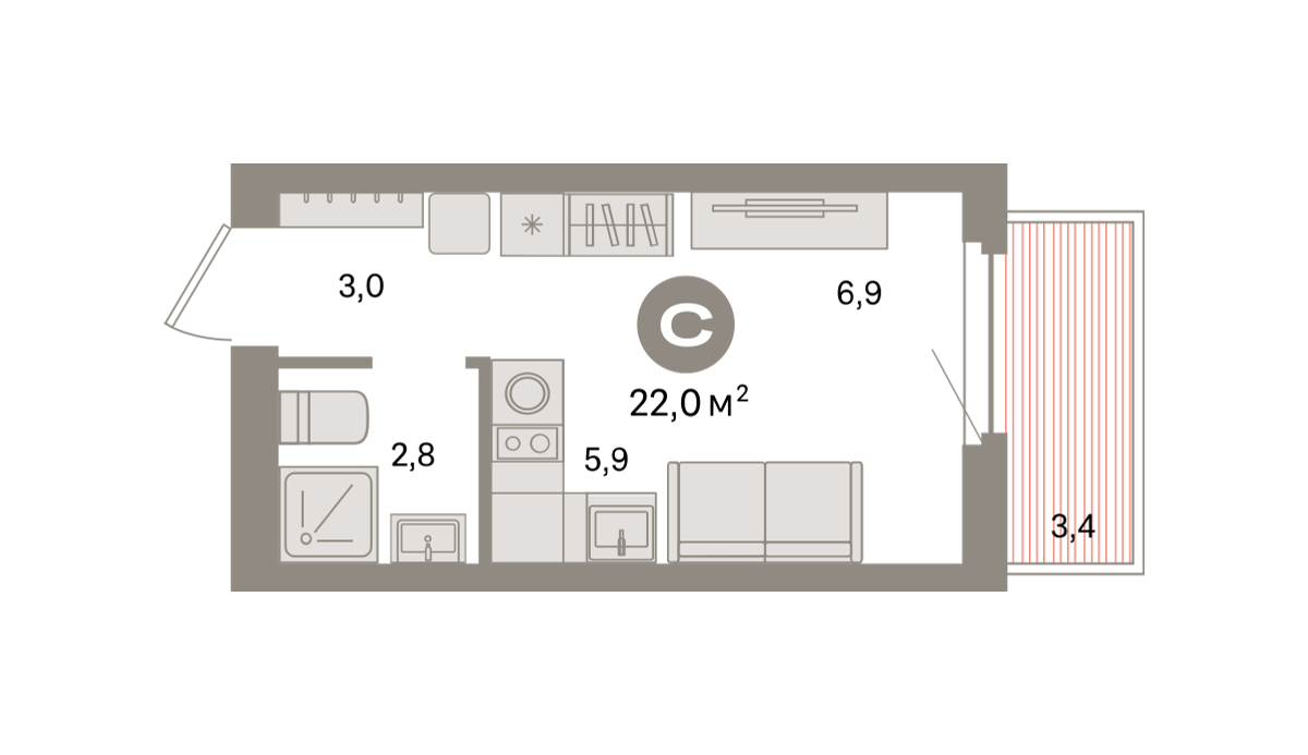 Студия в квартале «Депо». Особенности планировки: балкон, предчистовая отделка. № квартиры в нашей базе: ДЕП07-Ж4.7.3.