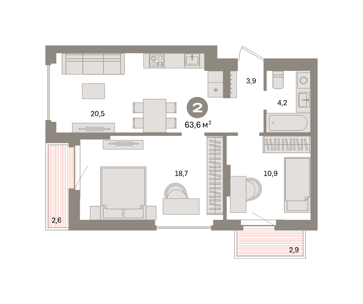 Продаётся с кладовой. Квартира с кухней-гостиной и двумя спальнями в квартале «Депо». Особенности планировки: балкон, предчистовая отделка. № квартиры в нашей базе: ДЕП07-Ж6.5.4.
