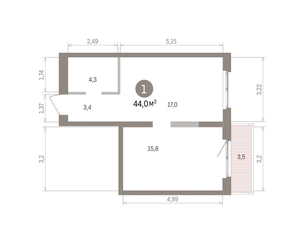 Квартира с кухней-гостиной и одной спальней в Южных кварталах. Особенности планировки: балкон, предчистовая отделка. № квартиры в нашей базе: ЮКВ08-Ж1.6.1.