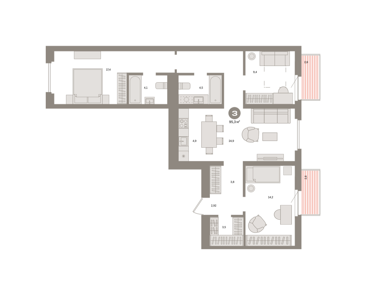 Продаётся с кладовой. Квартира с кухней-гостиной и тремя спальнями в Южных кварталах. Особенности планировки: балкон, окна на две стороны, предчистовая отделка, разнесённые спальни. № квартиры в нашей базе: ЮКВ11-Ж4.4.8.