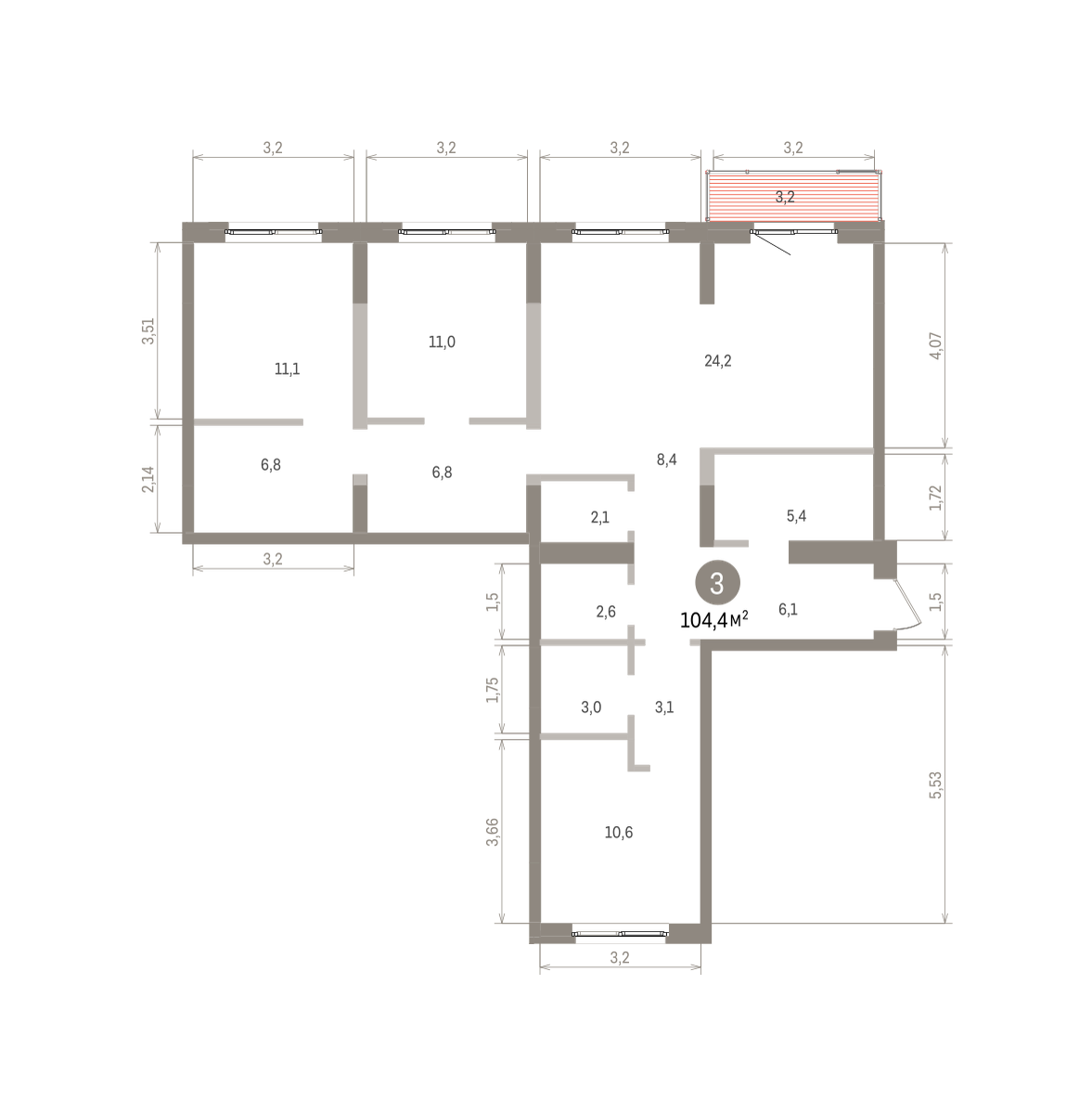 Квартира с кухней-гостиной и тремя спальнями в Южных кварталах. Особенности планировки: балкон, окна на две стороны, предчистовая отделка. № квартиры в нашей базе: ЮКВ08-Ж3.3.1.