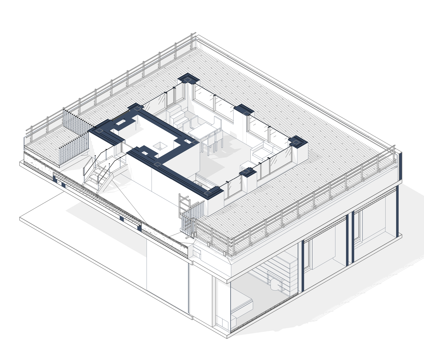 Квартира с кухней-гостиной и тремя спальнями в Южных кварталах. Особенности планировки: двухуровневая, летняя кухня на крыше, окна на две стороны, разнесённые спальни, свободная планировка, терраса на крыше.