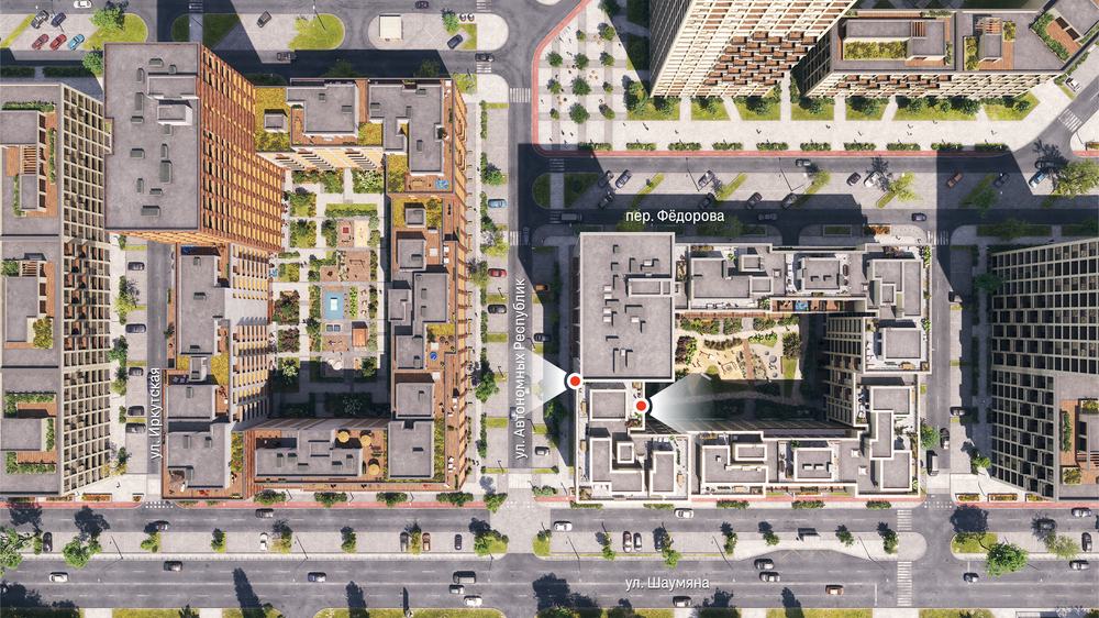 Двор закрыт от машин и оформлен в стиле скандинавского натурализма. Он похож на парк, сформировавшийся без участия человека и сохраняющий обаяние в течение всего года. Под домом запроектирован подземный паркинг, а также кладовые для хранения сезонных вещей.