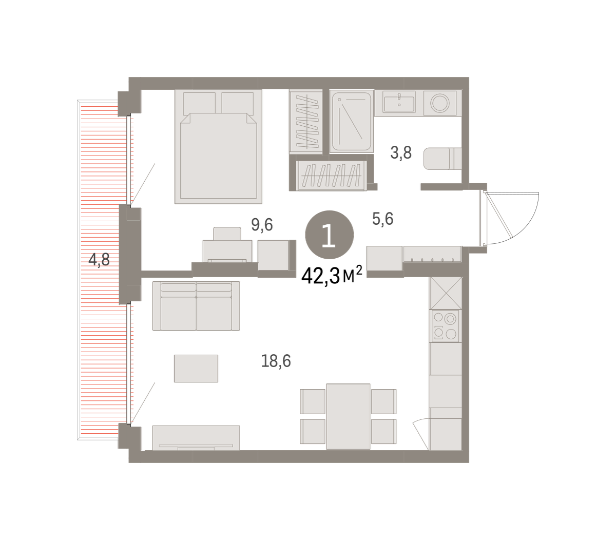 Продаётся с кладовой. Квартира с кухней-гостиной и одной спальней в Бруснике в Академическом. Особенности планировки: балкон, предчистовая отделка. № квартиры в нашей базе: АКД05-Ж8.4.5.