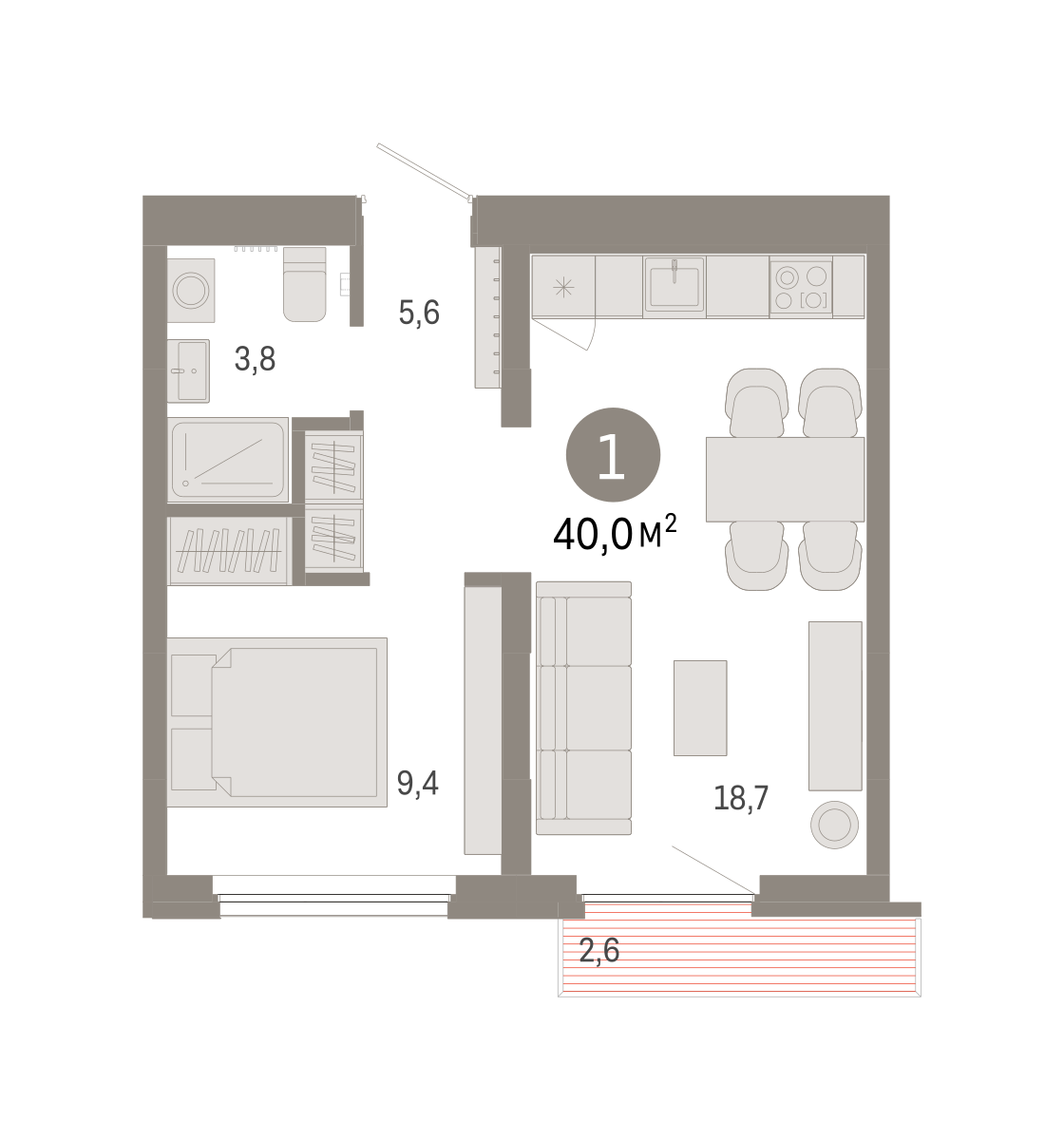Продаётся с кладовой. Квартира с кухней-гостиной и одной спальней в Бруснике в Академическом. Особенности планировки: балкон, предчистовая отделка. № квартиры в нашей базе: АКД04-Ж4.2.2.