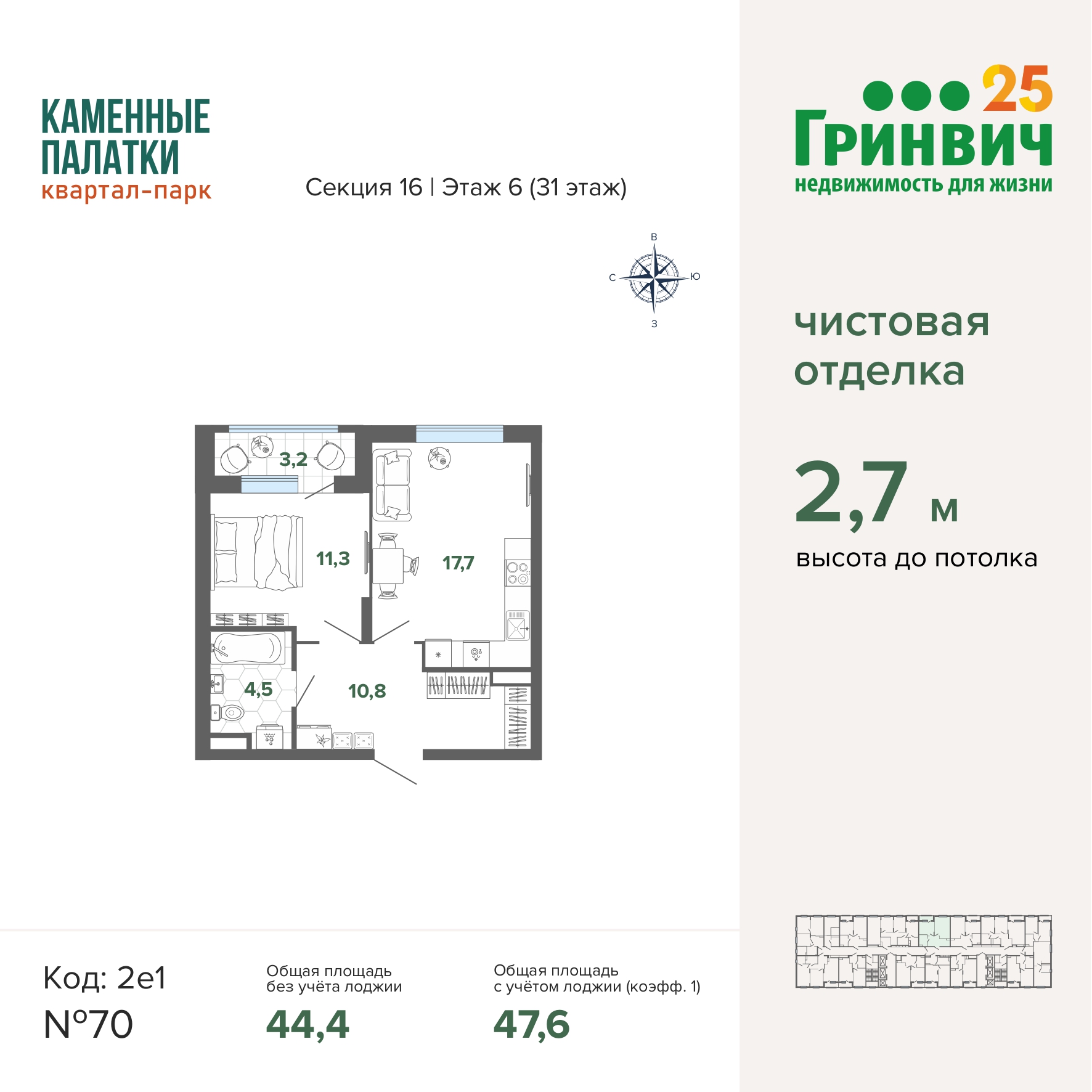 • Высокие потолки (2,7 м);