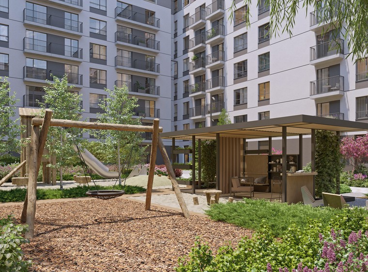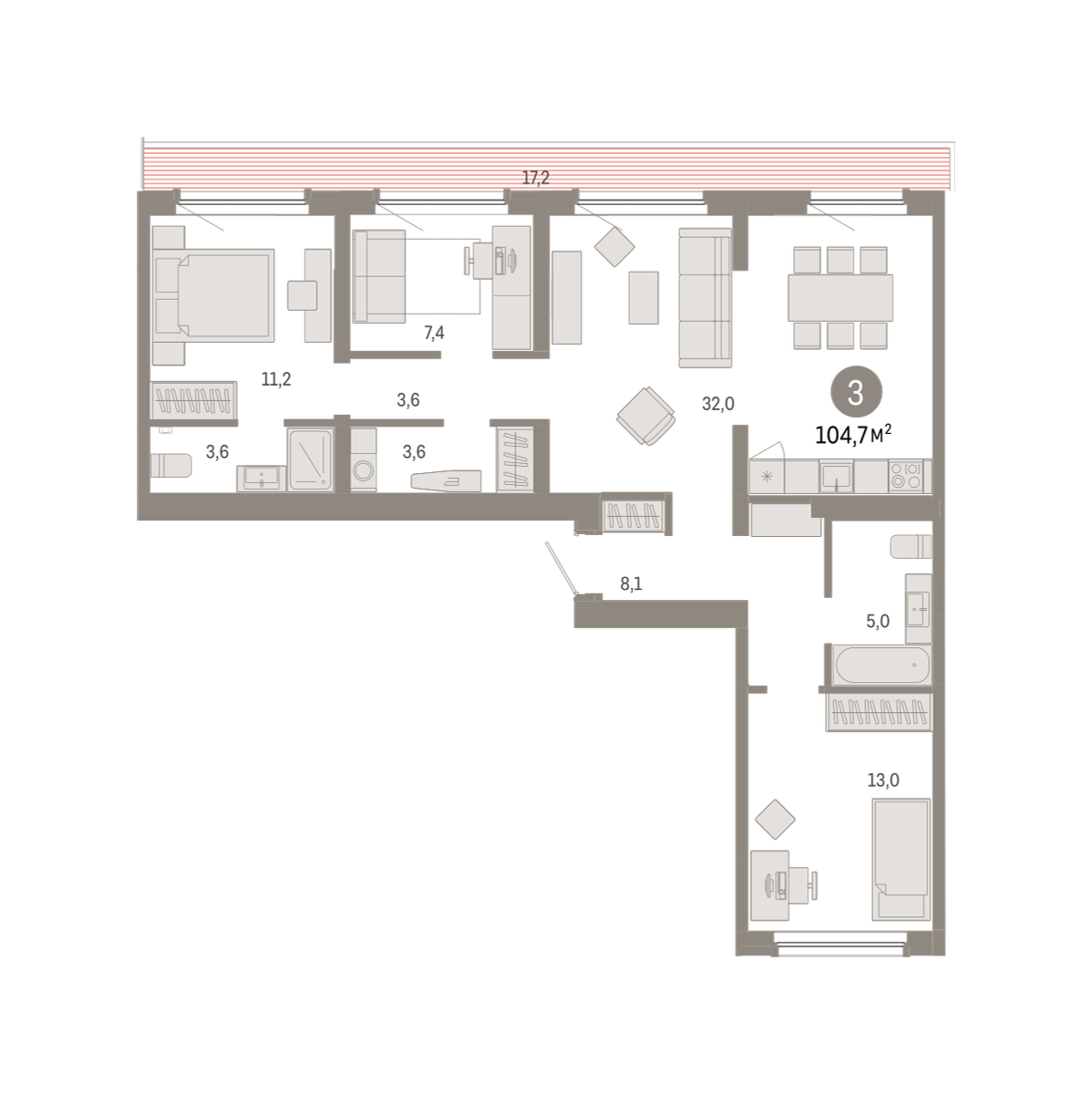 Квартира с кухней-гостиной и тремя спальнями в Бруснике в Академическом. Особенности планировки: вид во двор, второй санузел, мастер-спальня, постирочная, предчистовая отделка, разнесённые спальни, терраса на крыше.