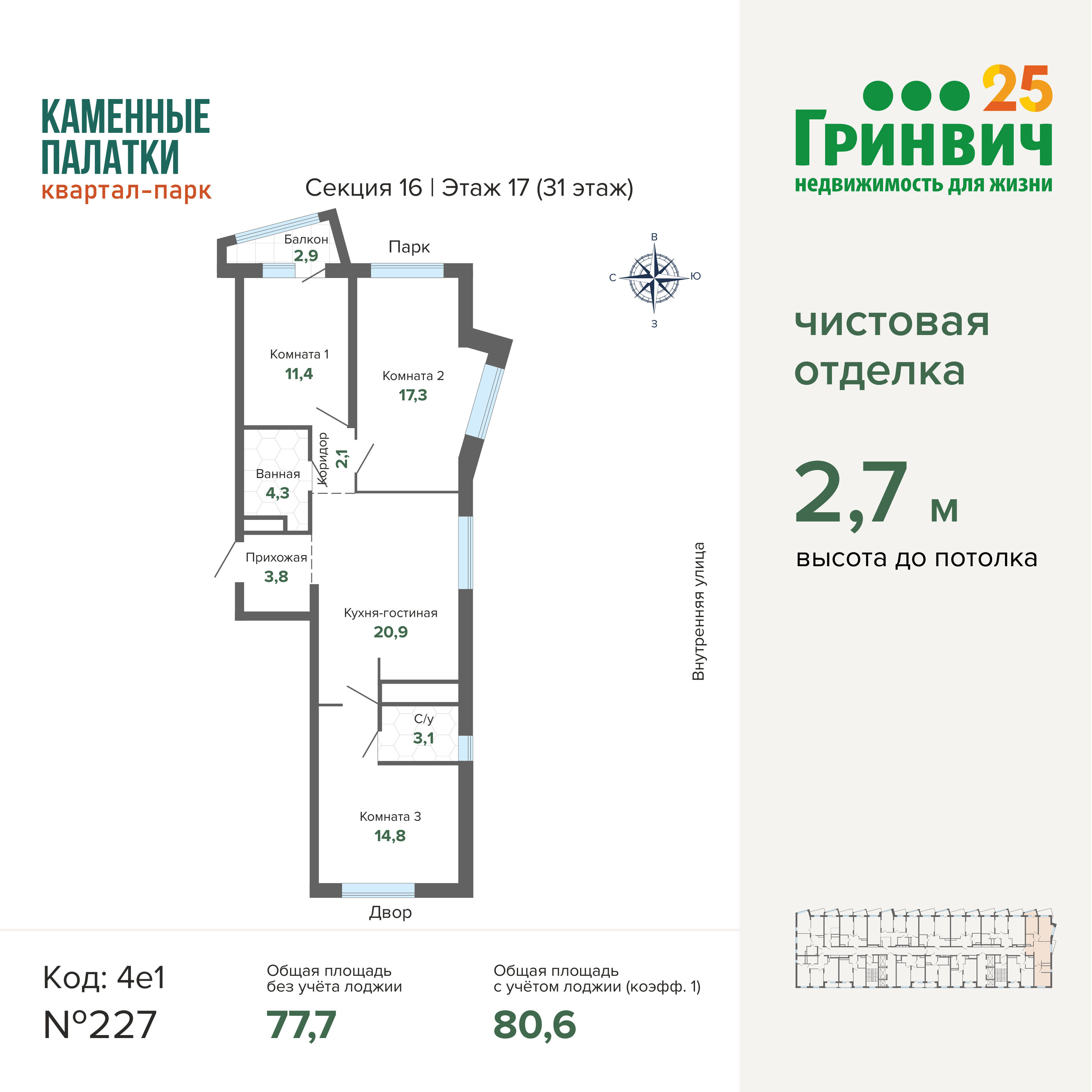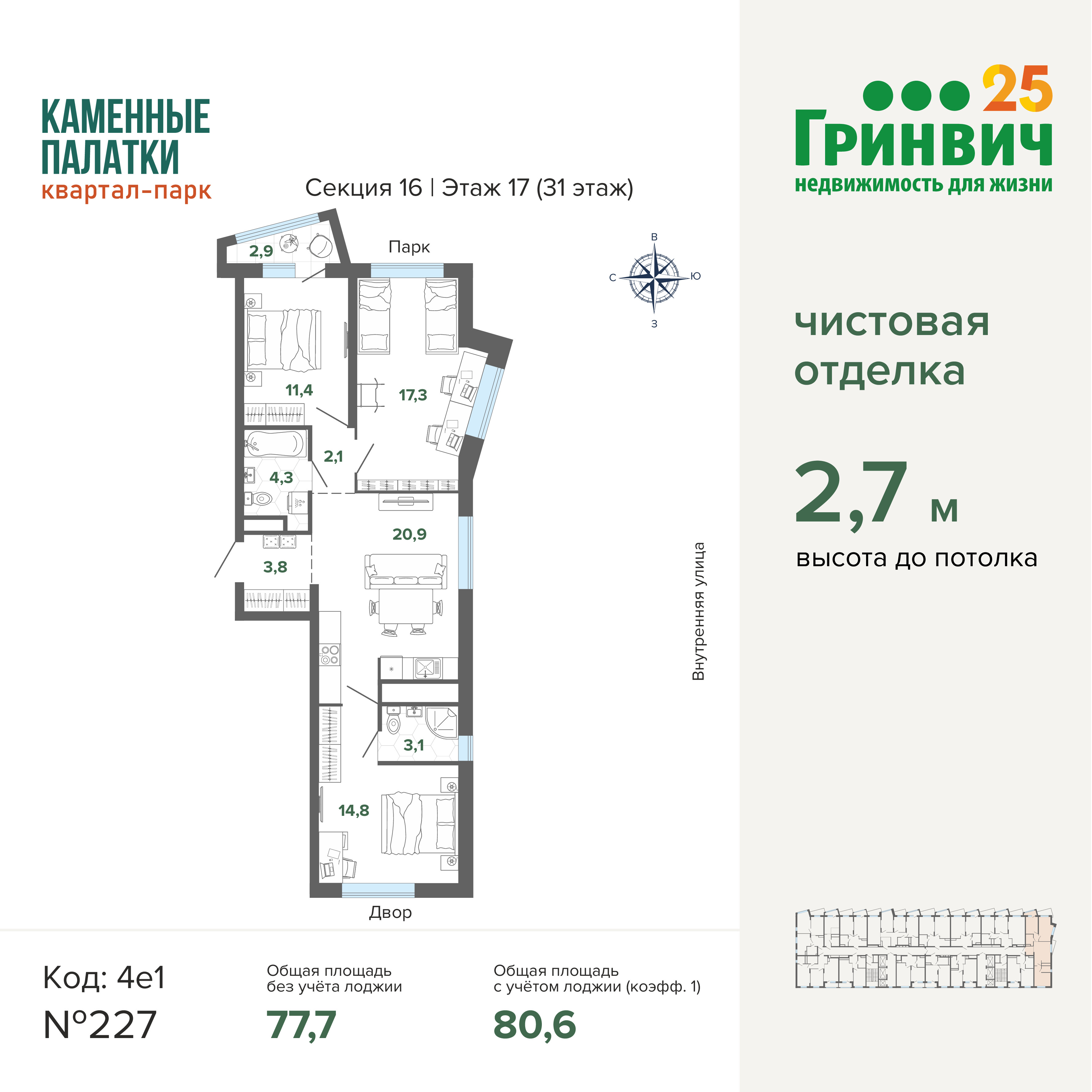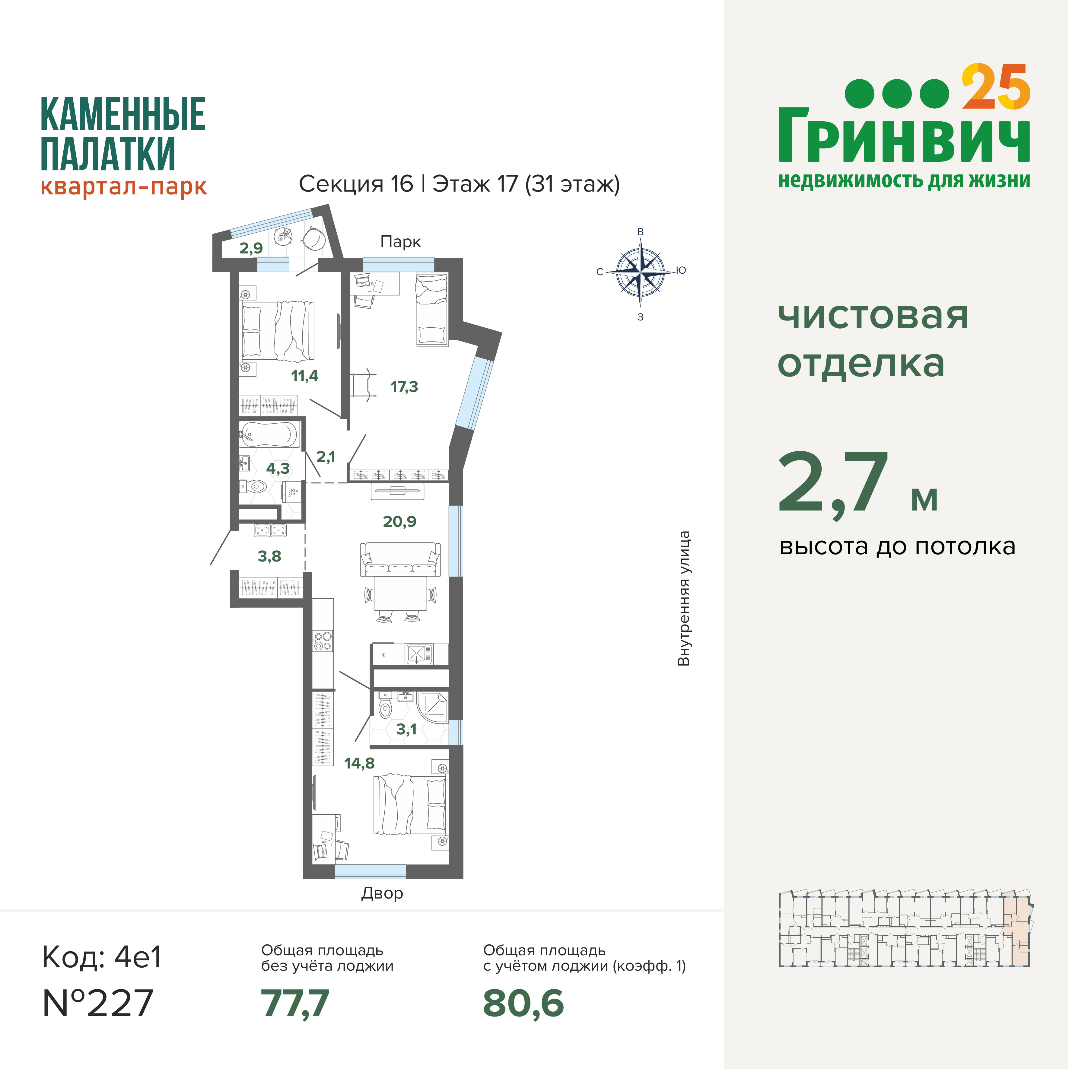 • Высокие потолки (2,7 м);
