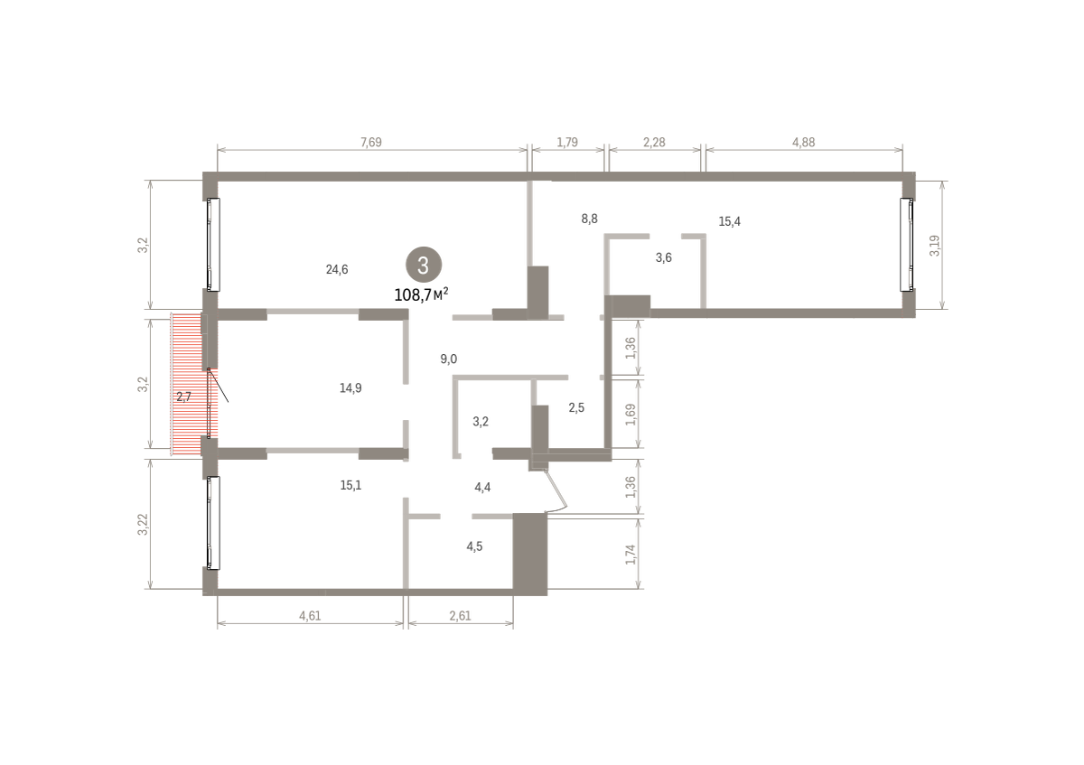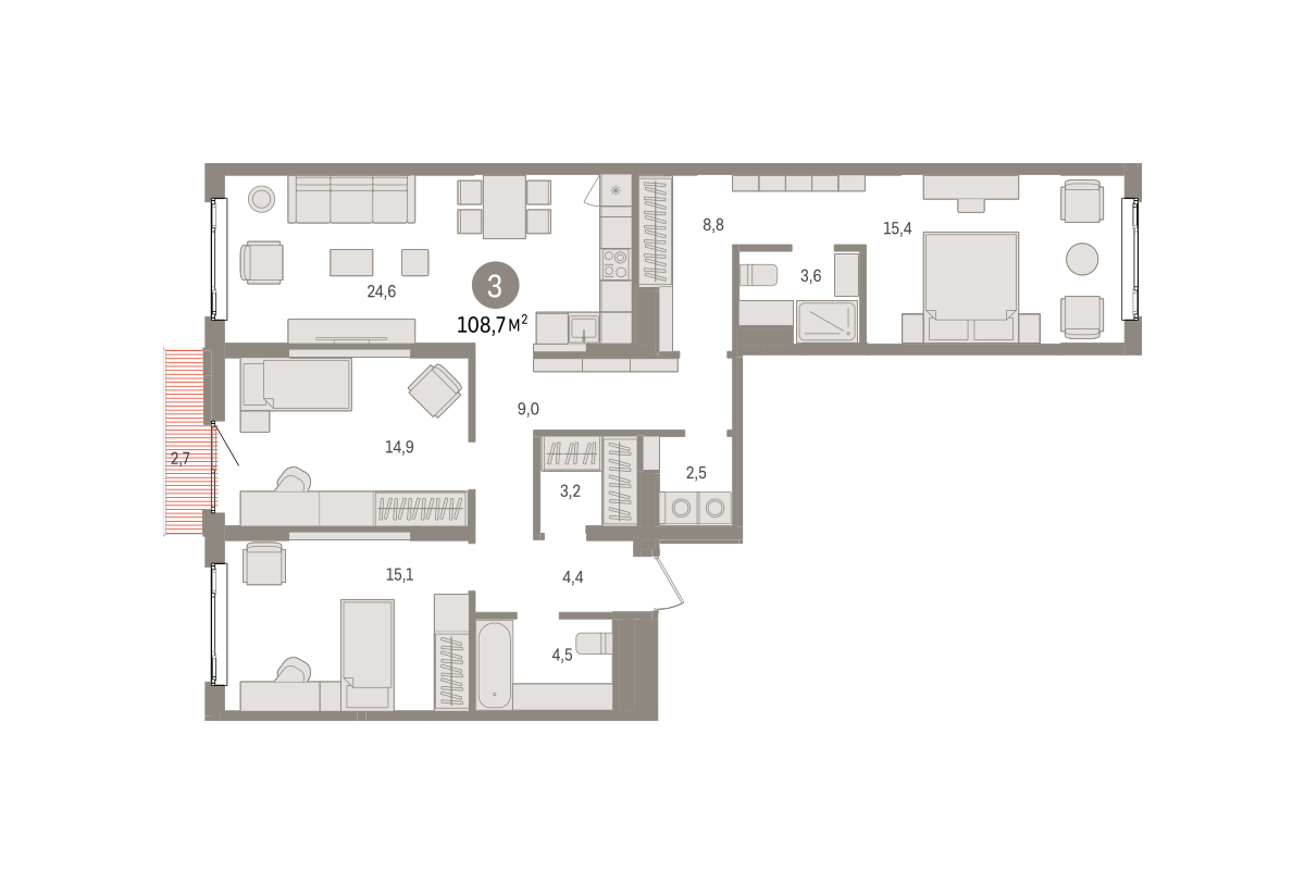 Квартира с кухней-гостиной и тремя спальнями в квартале «Траектория». Особенности планировки: балкон, окна на две стороны, предчистовая отделка, разнесённые спальни, стартовая цена. № квартиры в нашей базе: МНВ01-Ж3.4.1.