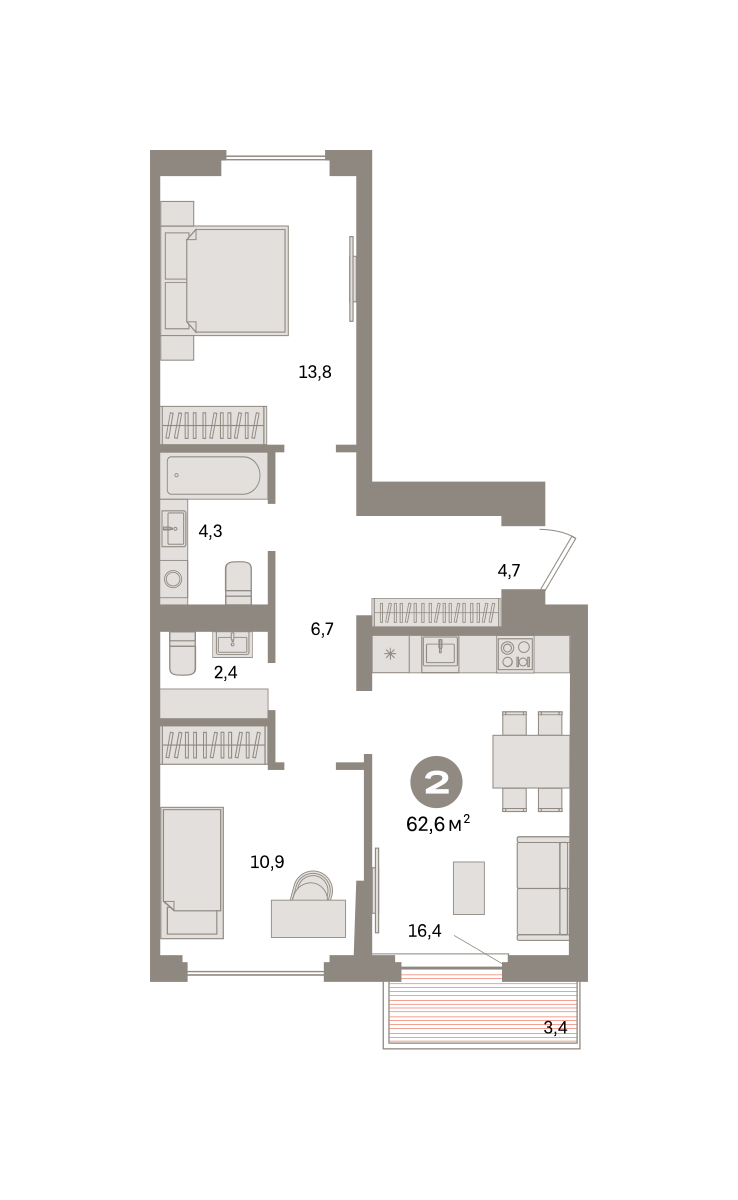 Квартира с кухней-гостиной и двумя спальнями в квартале «Депо». Особенности планировки: балкон, окна на две стороны, предчистовая отделка, разнесённые спальни. № квартиры в нашей базе: ДЕП07-Ж2.6.2.