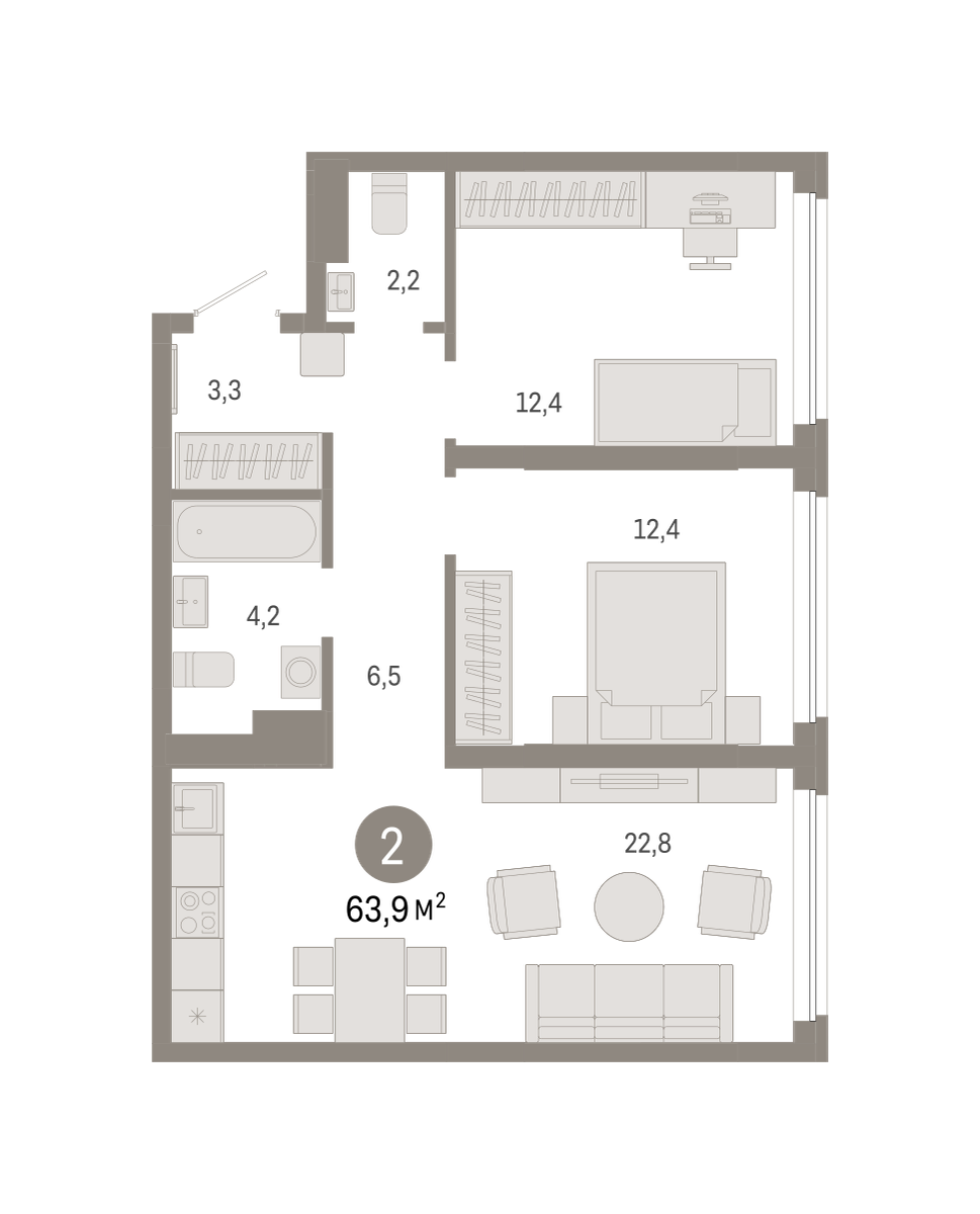 Двухкомнатная квартира в микрорайоне «Шишимская горка» от застройщика «Брусника» — это квартира с объединенной кухней-гостиной и двумя спальнями. В квартире предусмотрена просторная ванная комната, гостевой санузел, пространства под хранение вещей. Комнаты в двухкомнатной квартире имеют правильную прямоугольную форму близкую к квадрату. Отсутствуют лишние углы и выступы. Гардеробные и ниши для шкафов помогают разумно использовать пространство 2к квартиры, иметь больше свободного места.