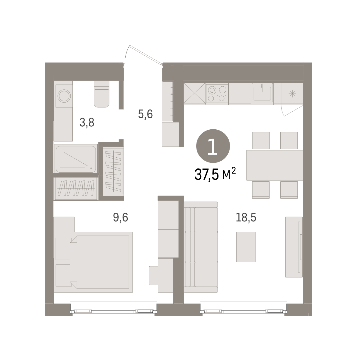 Квартира с кухней-гостиной и одной спальней в квартале «Траектория». Особенности планировки: предчистовая отделка, стартовая цена. № квартиры в нашей базе: МНВ01-Ж4.3.2.