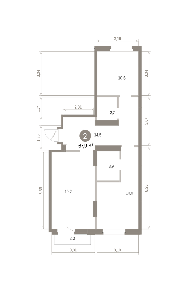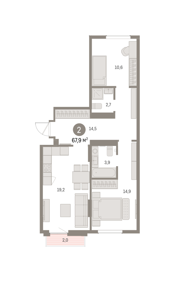 Квартира с кухней-гостиной и двумя спальнями в Бруснике в Академическом. Особенности планировки: балкон, вид во двор, мастер-спальня, окна на две стороны, предчистовая отделка, разнесённые спальни.