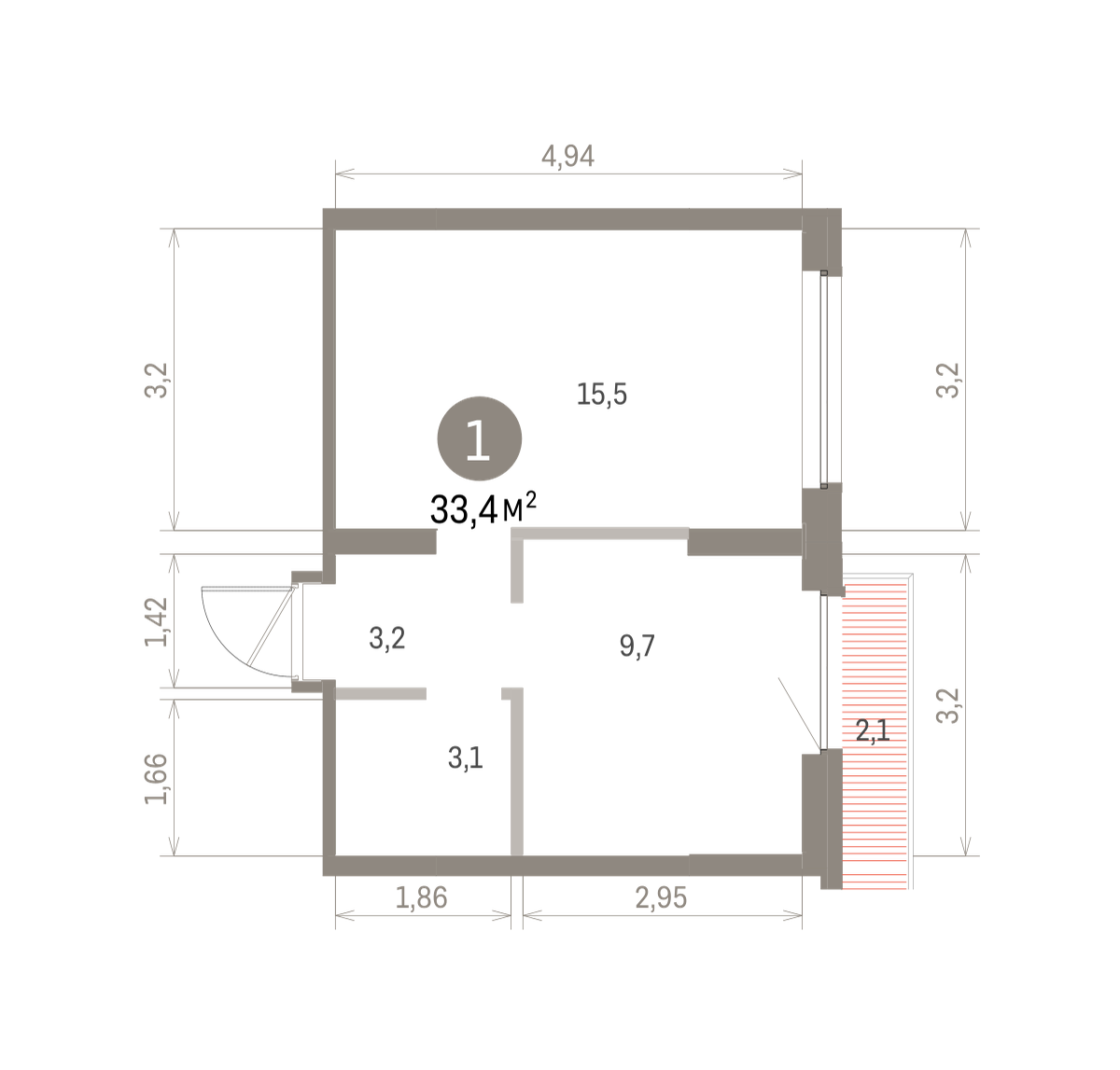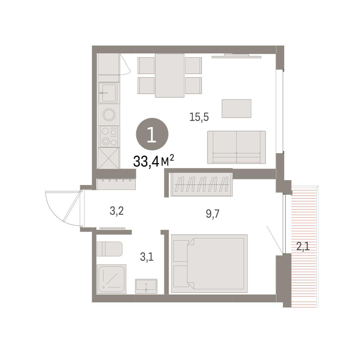 Квартира с кухней-гостиной и одной спальней в Бруснике в Академическом. Особенности планировки: балкон, предчистовая отделка. № квартиры в нашей базе: АКД05-Ж5.8.2.