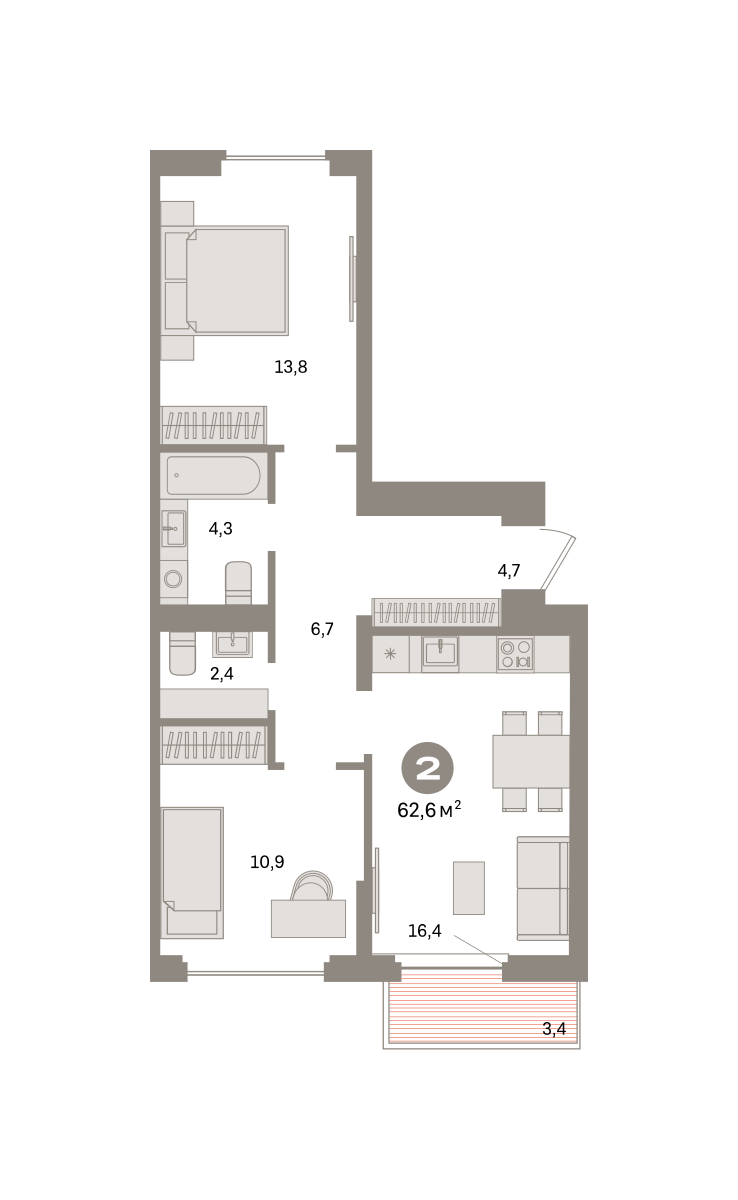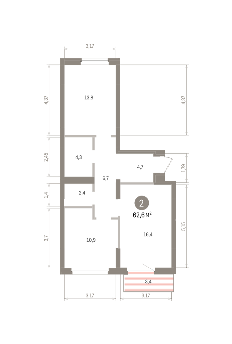 Квартира с кухней-гостиной и двумя спальнями в квартале «Депо». Особенности планировки: балкон, вид во двор, второй санузел, окна на две стороны, предчистовая отделка, разнесённые спальни. № квартиры в нашей базе: ДЕП07-Ж2.4.2.