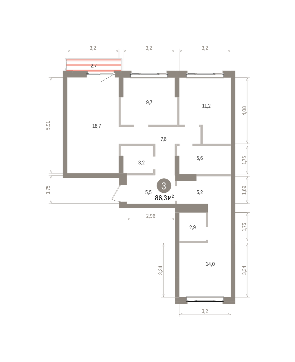 Квартира с кухней-гостиной и тремя спальнями в квартале «Траектория». Особенности планировки: балкон, вид во двор, гардеробная, мастер-спальня, окна на две стороны, предчистовая отделка, разнесённые спальни, стартовая цена.