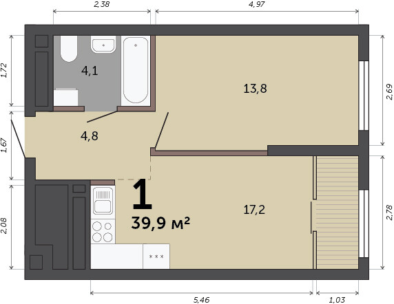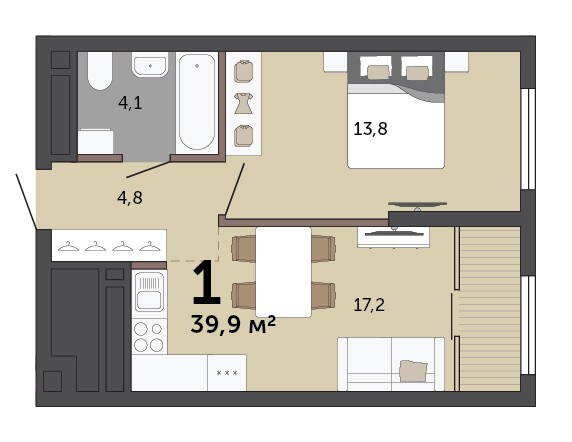 1-к квартира | 39.00 м² | 13 - 20 эт.