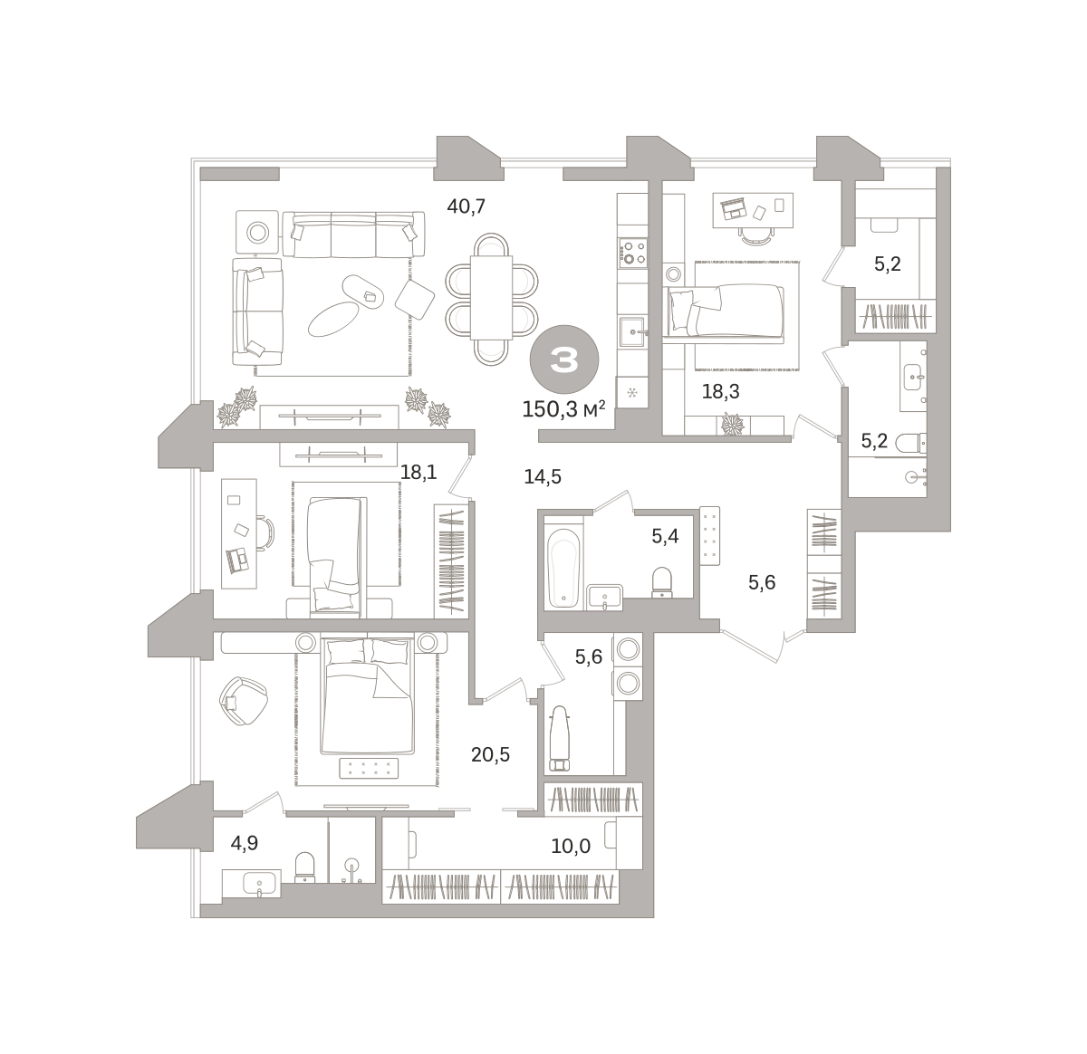Квартира с кухней-гостиной и тремя спальнями в проекте Гоголя 21. Особенности планировки: свободная планировка. № квартиры в нашей базе: ЗНГ01-Ж1.18.3.