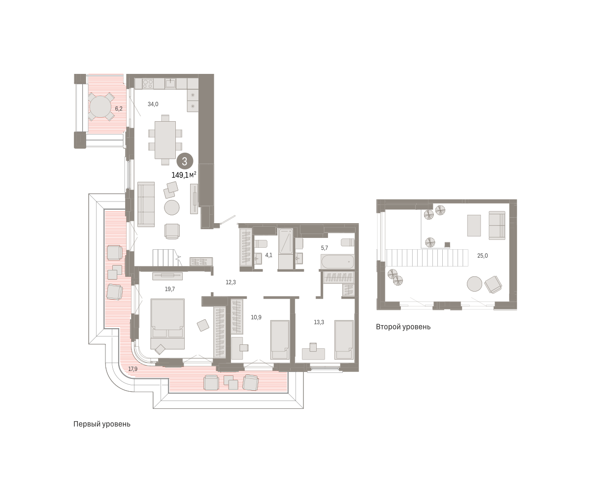 Двухуровневая квартира с кухней-гостиной и тремя спальнями в квартале «На Некрасова». Особенности планировки: второй санузел, двухуровневая, предчистовая отделка, разнесённые спальни, терраса на крыше. № квартиры в нашей базе: НКР02-Ж2.9.2.