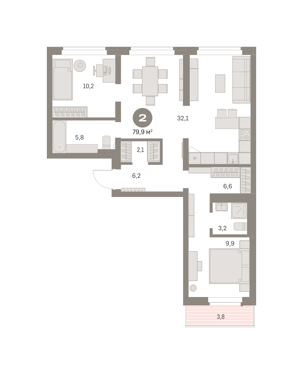 Квартира с кухней-гостиной и двумя спальнями в Бруснике в Академическом. Особенности планировки: вид во двор, второй санузел, гардеробная, мастер-спальня, предчистовая отделка, разнесённые спальни, терраса на крыше.