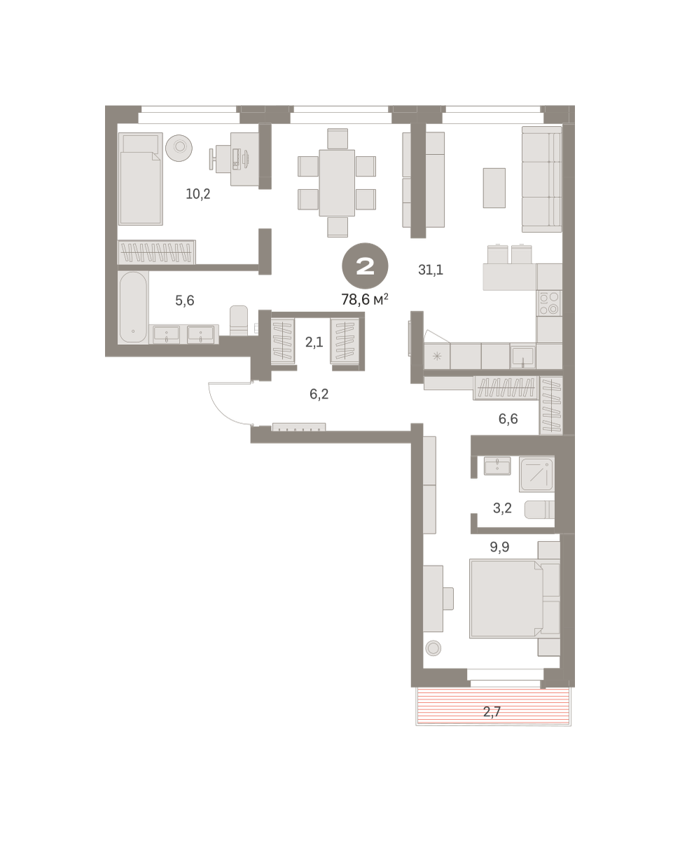 Квартира с кухней-гостиной и двумя спальнями в Бруснике в Академическом. Особенности планировки: балкон, вид во двор, второй санузел, гардеробная, мастер-спальня, предчистовая отделка, разнесённые спальни.