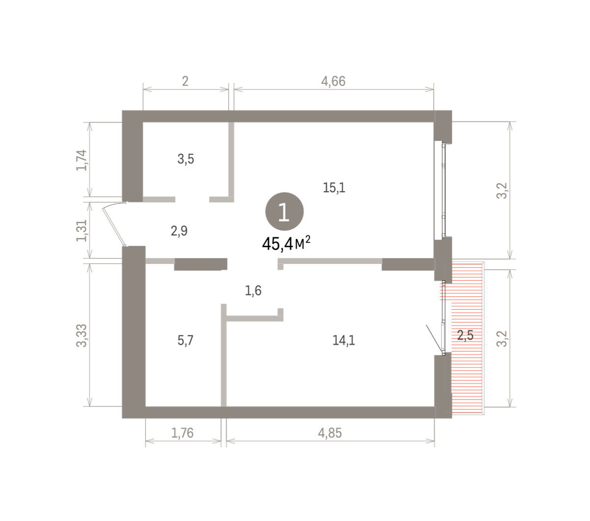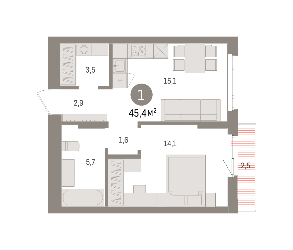 Квартира с кухней-гостиной и одной спальней в квартале «Траектория». Особенности планировки: балкон, гардеробная, предчистовая отделка, стартовая цена. № квартиры в нашей базе: МНВ01-Ж12.7.5.