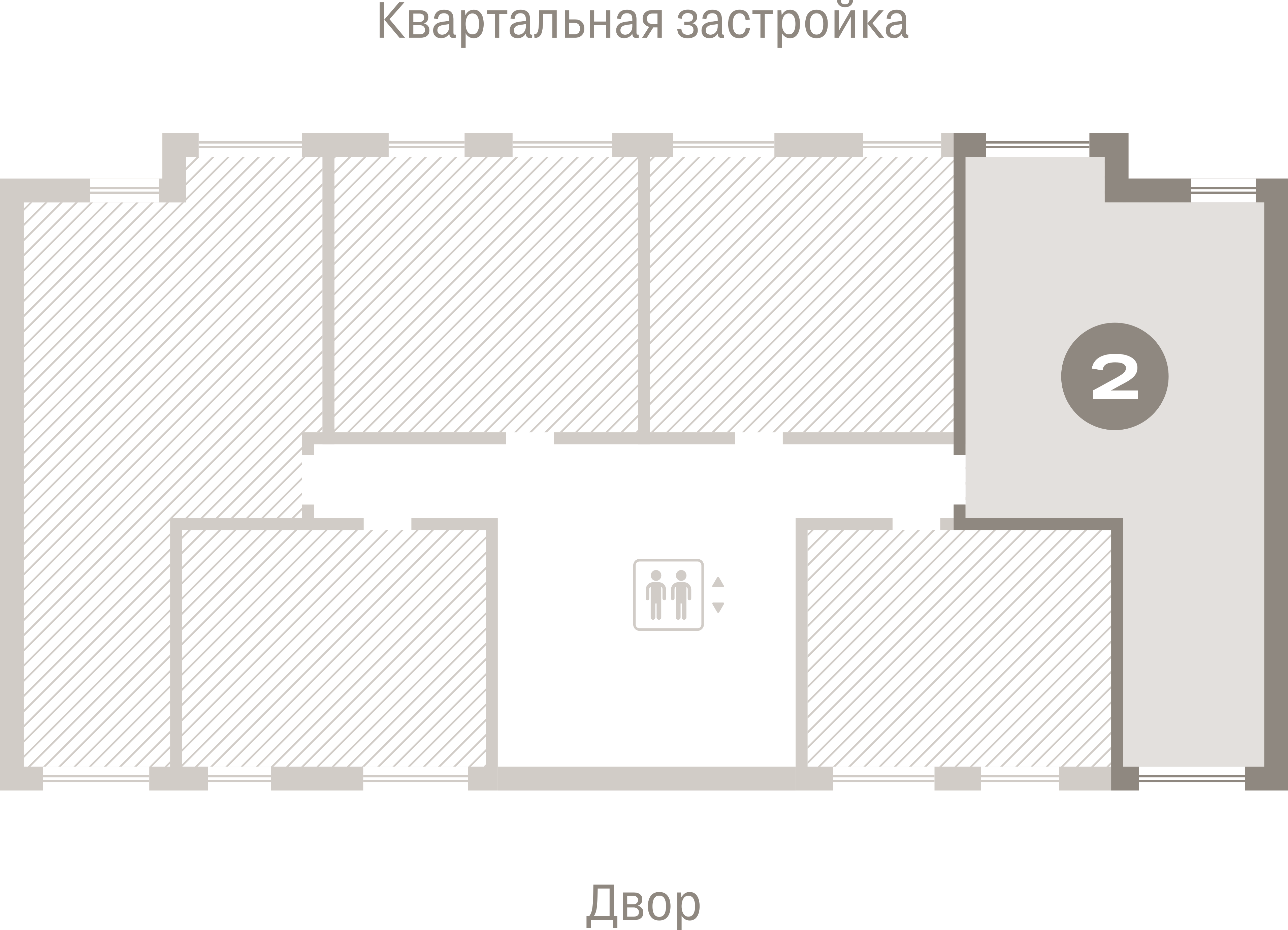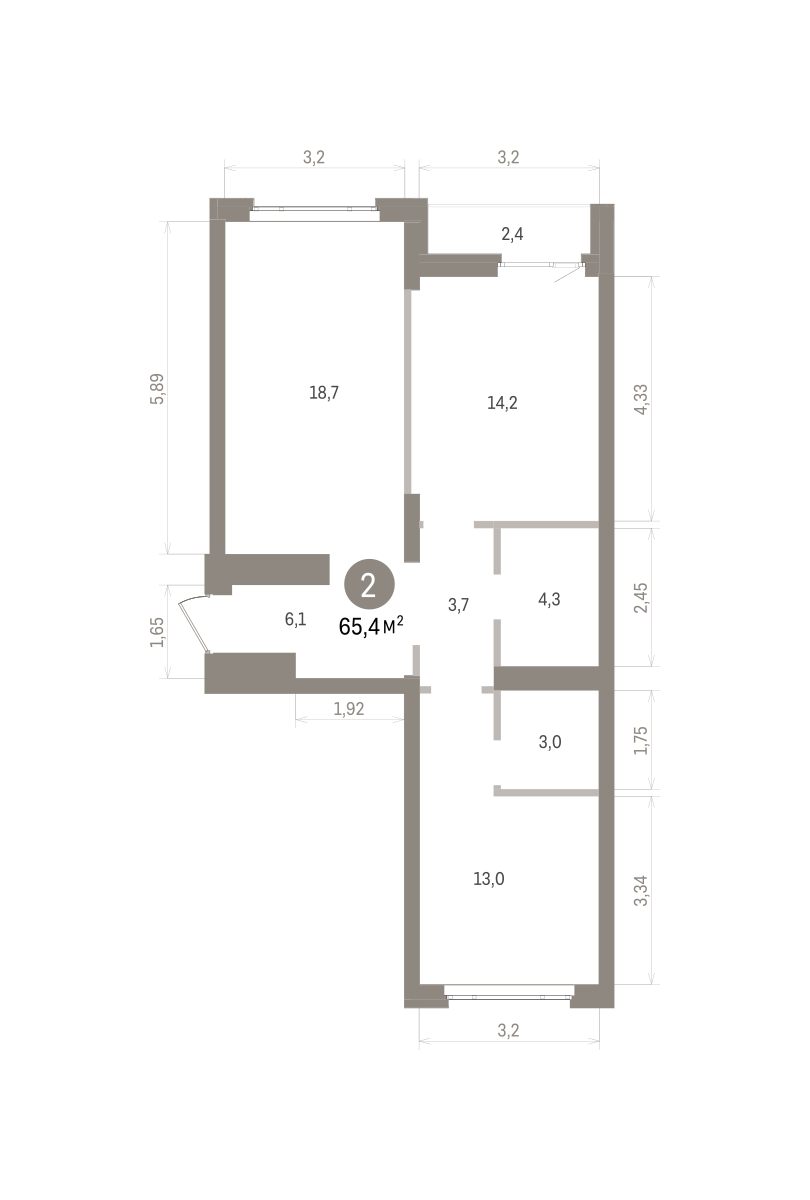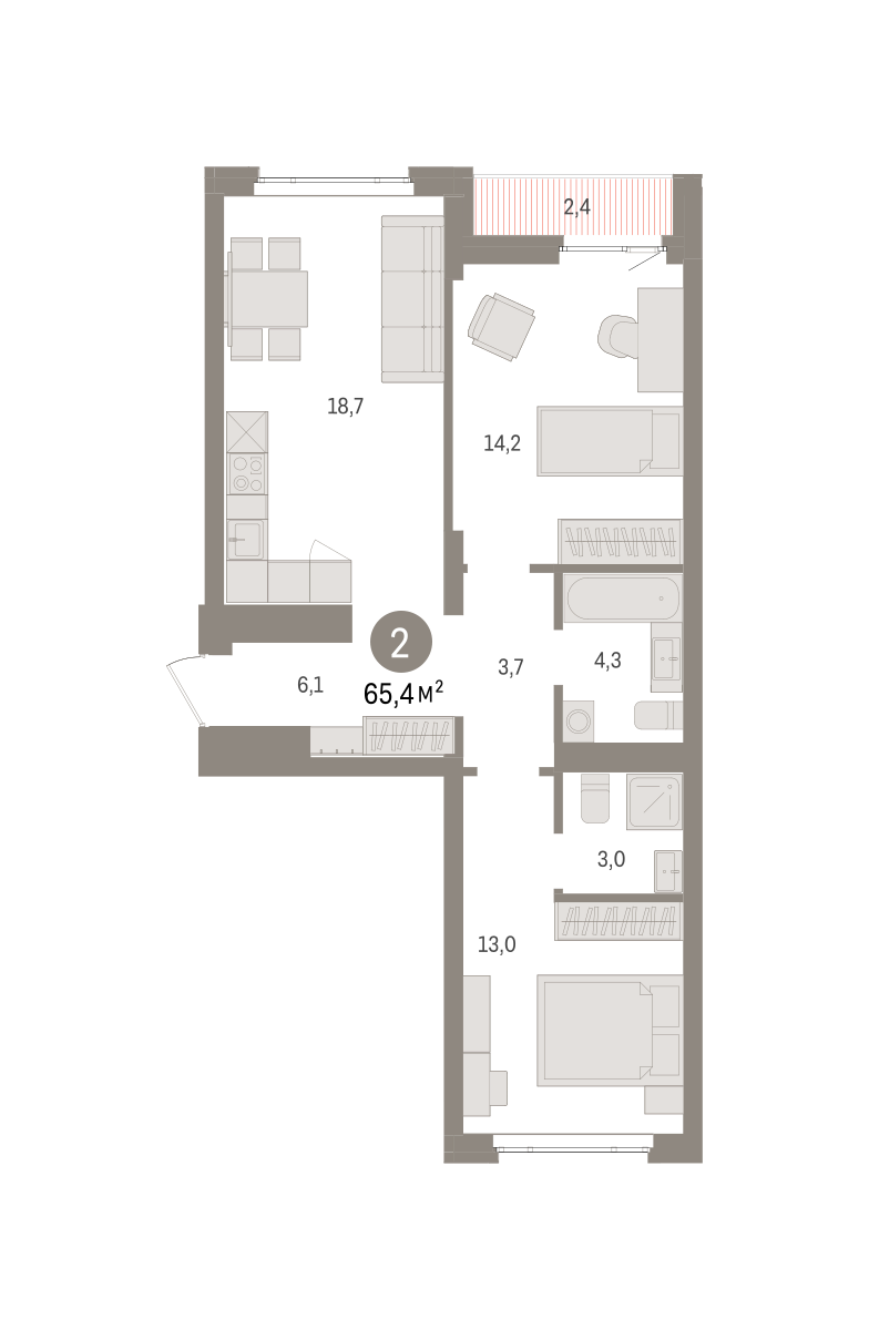 Квартира с кухней-гостиной и двумя спальнями в квартале «Траектория». Особенности планировки: вид во двор, лоджия, мастер-спальня, окна на две стороны, предчистовая отделка, разнесённые спальни.