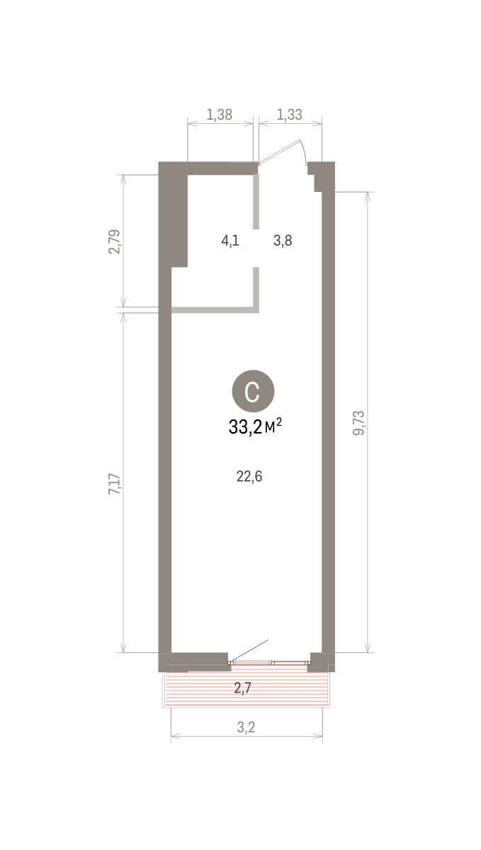 Студия в квартале «Траектория». Особенности планировки: балкон, предчистовая отделка. № квартиры в нашей базе: МНВ01-Ж1.13.4.