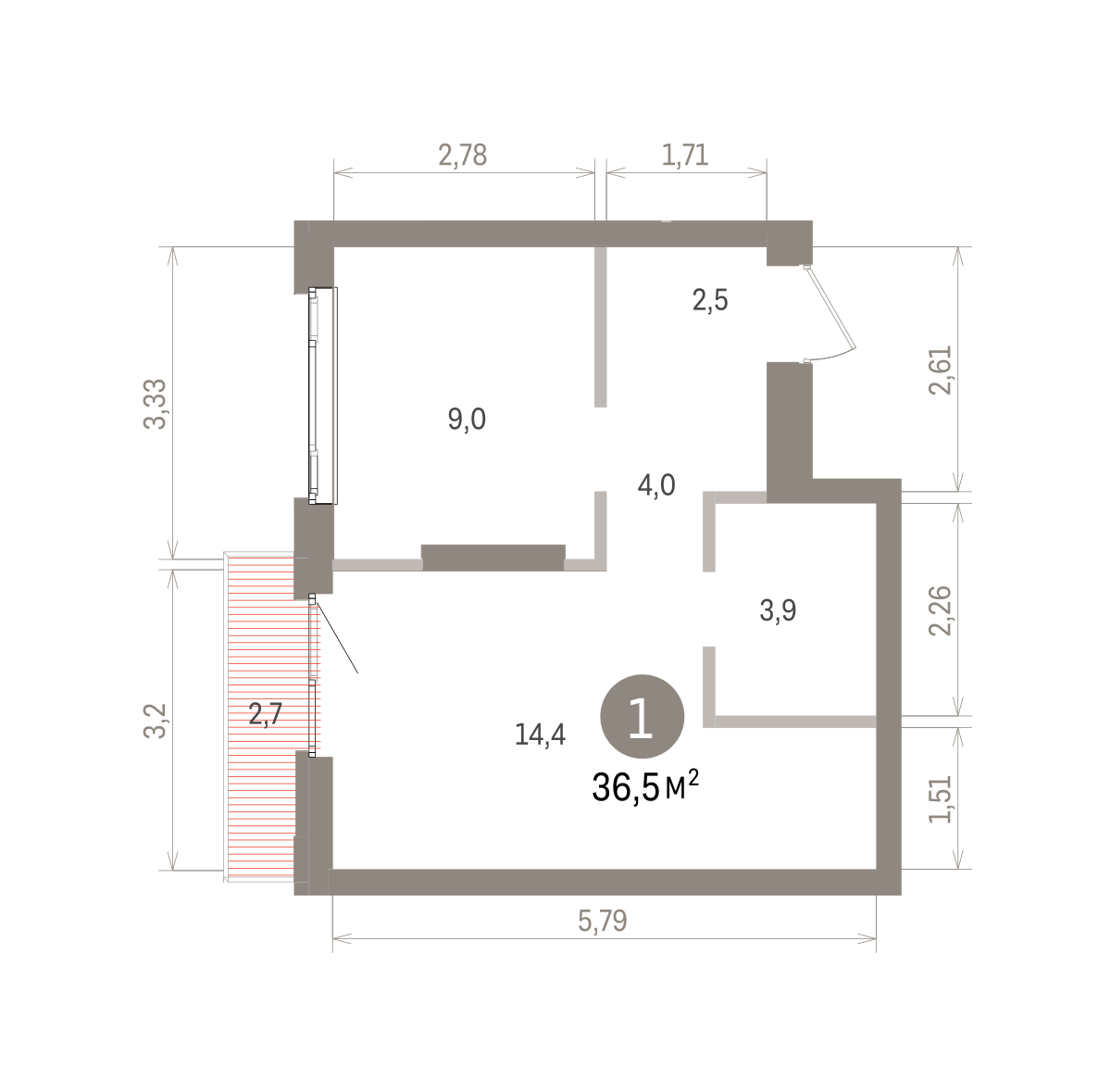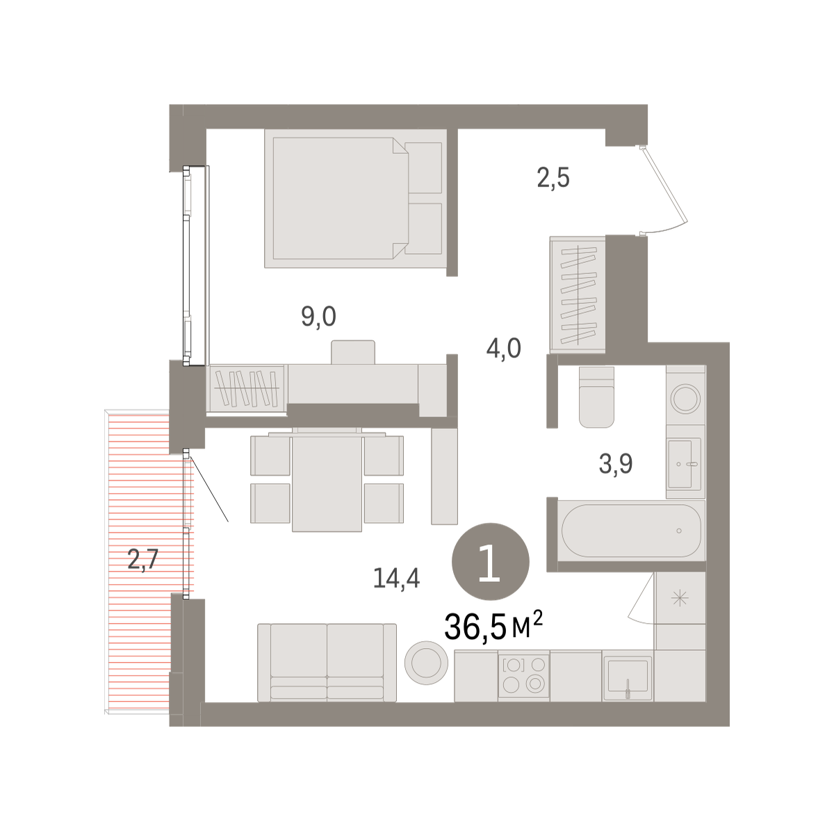 Квартира с кухней-гостиной и одной спальней в квартале «Траектория». Особенности планировки: балкон, предчистовая отделка. № квартиры в нашей базе: МНВ01-Ж1.14.7.