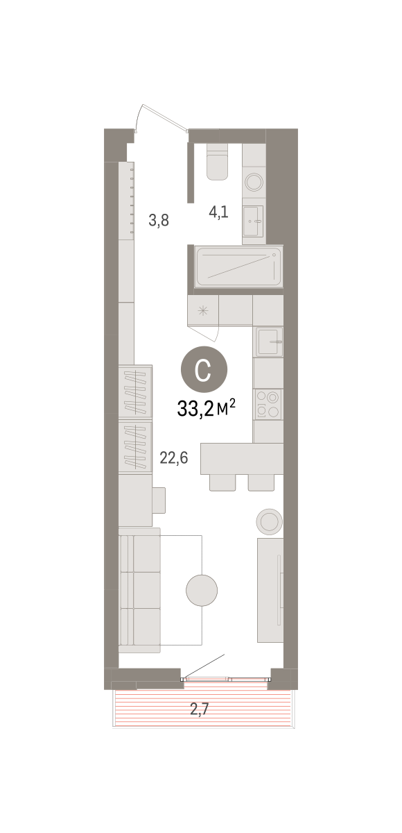 Студия в квартале «Траектория». Особенности планировки: балкон, предчистовая отделка. № квартиры в нашей базе: МНВ01-Ж1.13.3.